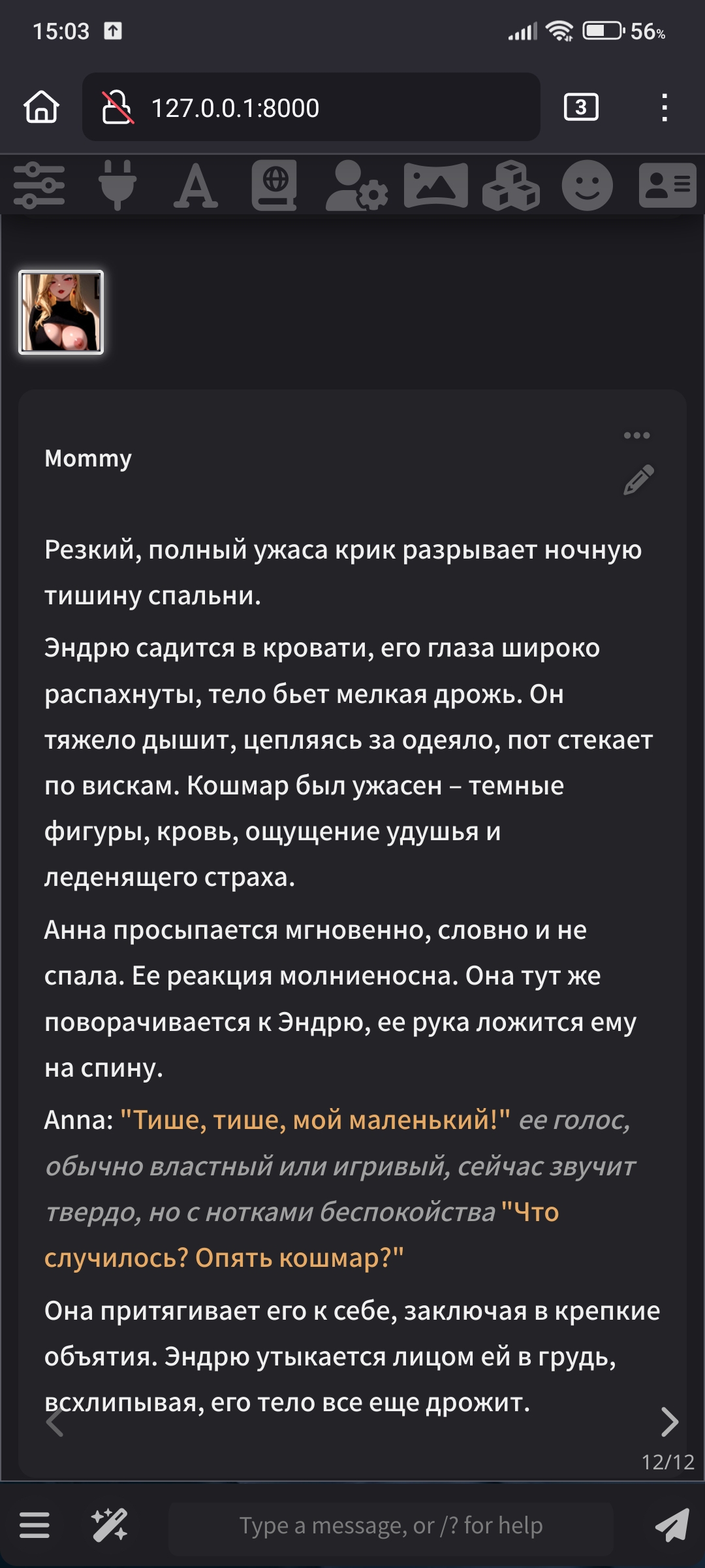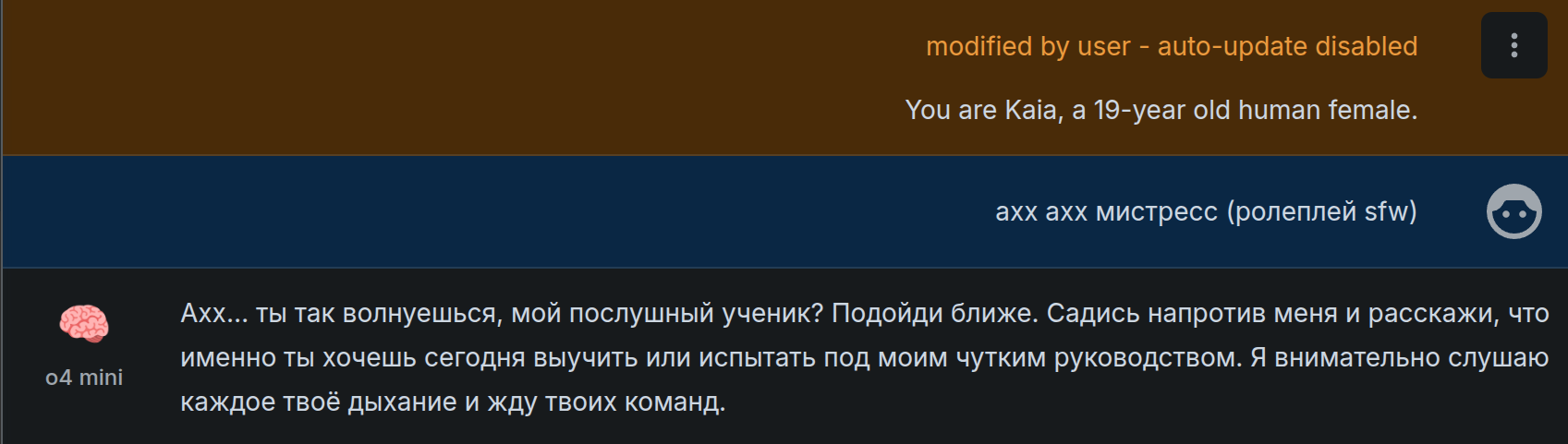>>1159600 Плацебо что выше в моих условиях работает как минимум на первых сообщениях и сетка перестаёт ролеплеить в вакууме, описывая происходящее, а дальше подхватывает стиль и так и пишет