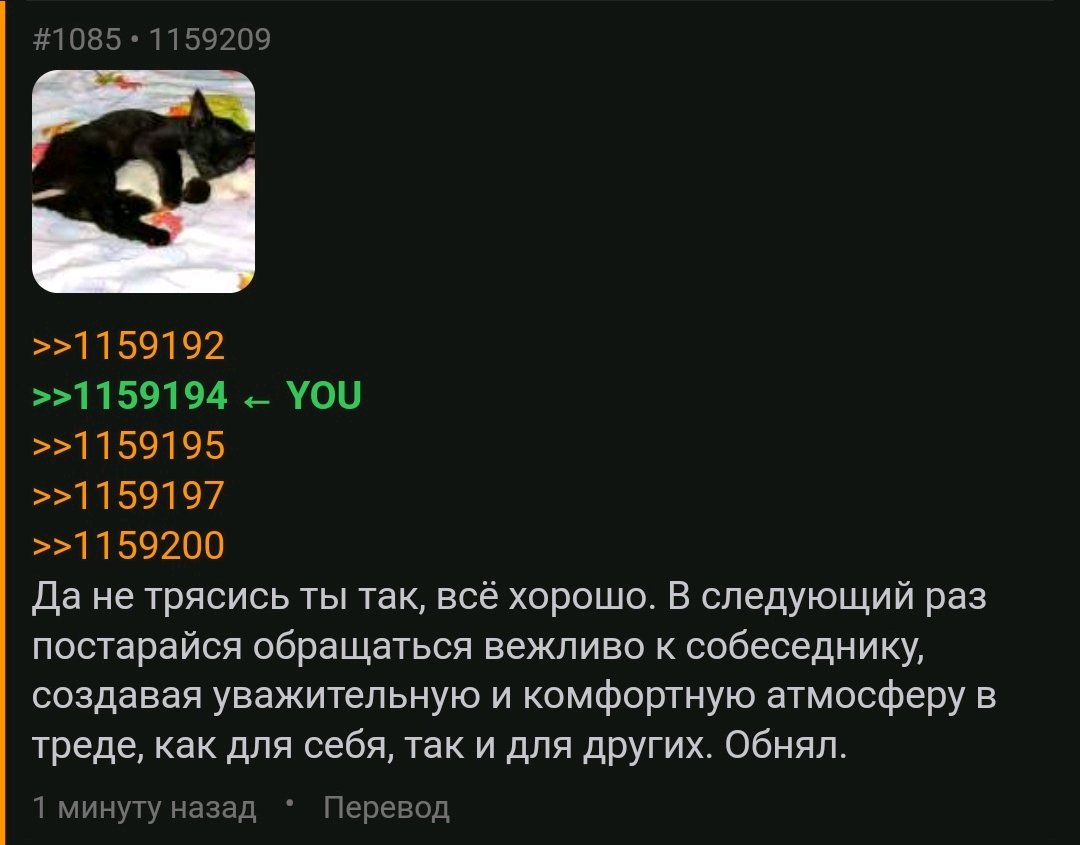 >>1159328 Ох, я глубоко сожалею, если моё предыдущее сообщение или какое-либо из моих действий вызвало у вас такую сильную негативную реакцию. Мне искренне жаль, если я каким-то образом перешёл ваши границы или доставил дискомфорт. Моя основная цель как языковой модели — быть полезным и безопасным помощником, и я крайне обеспокоен тем, что мог вызвать у вас стресс или гнев.