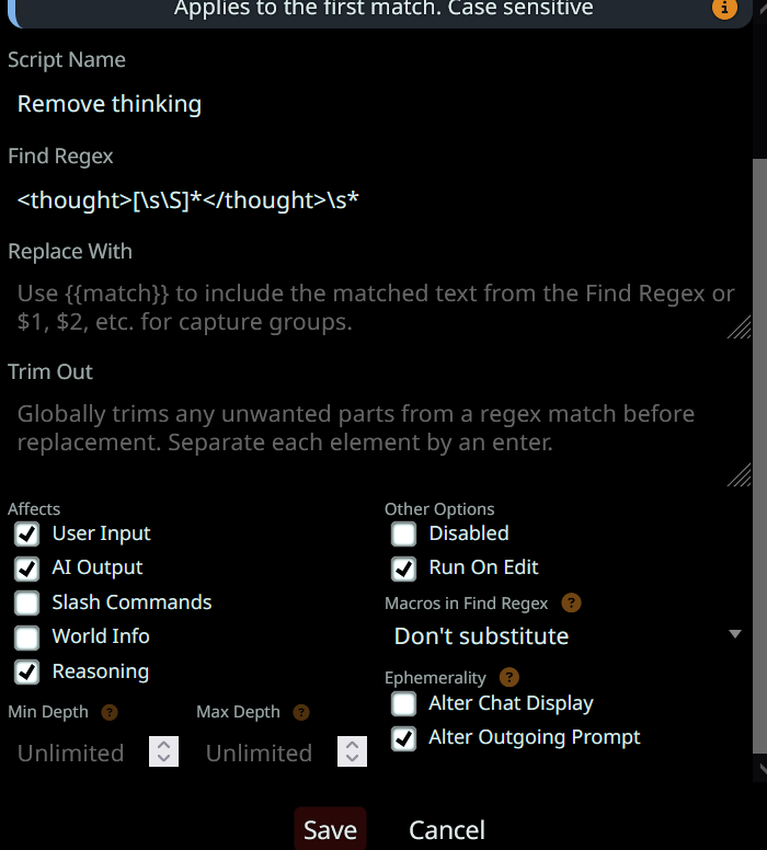 Пробовал кучу вариантов настроек и такие матчеры: - <thought>[\s\S]</thought>\s - <thought>[\s\S]<\/thought>\s