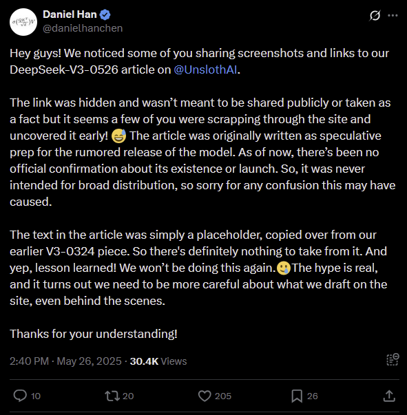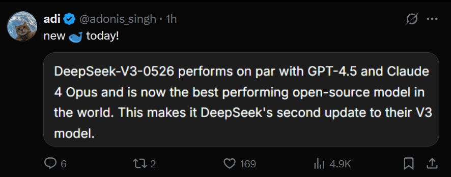 DeepSeek-V3-0526 performs on par with GPT-4.5 and Claude 4 Opus and is now the best performing open-source model in the world. This makes it DeepSeek's second update to their V3 model.