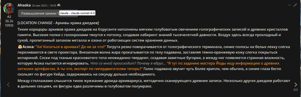 >>1217354 Работало только на 2.1 и опусе, на клоде 3.5+ у тебя с ним будет только луп на расчесочных параграфах. Мягкий промптинг тегами на новых клодах вообще не работает.