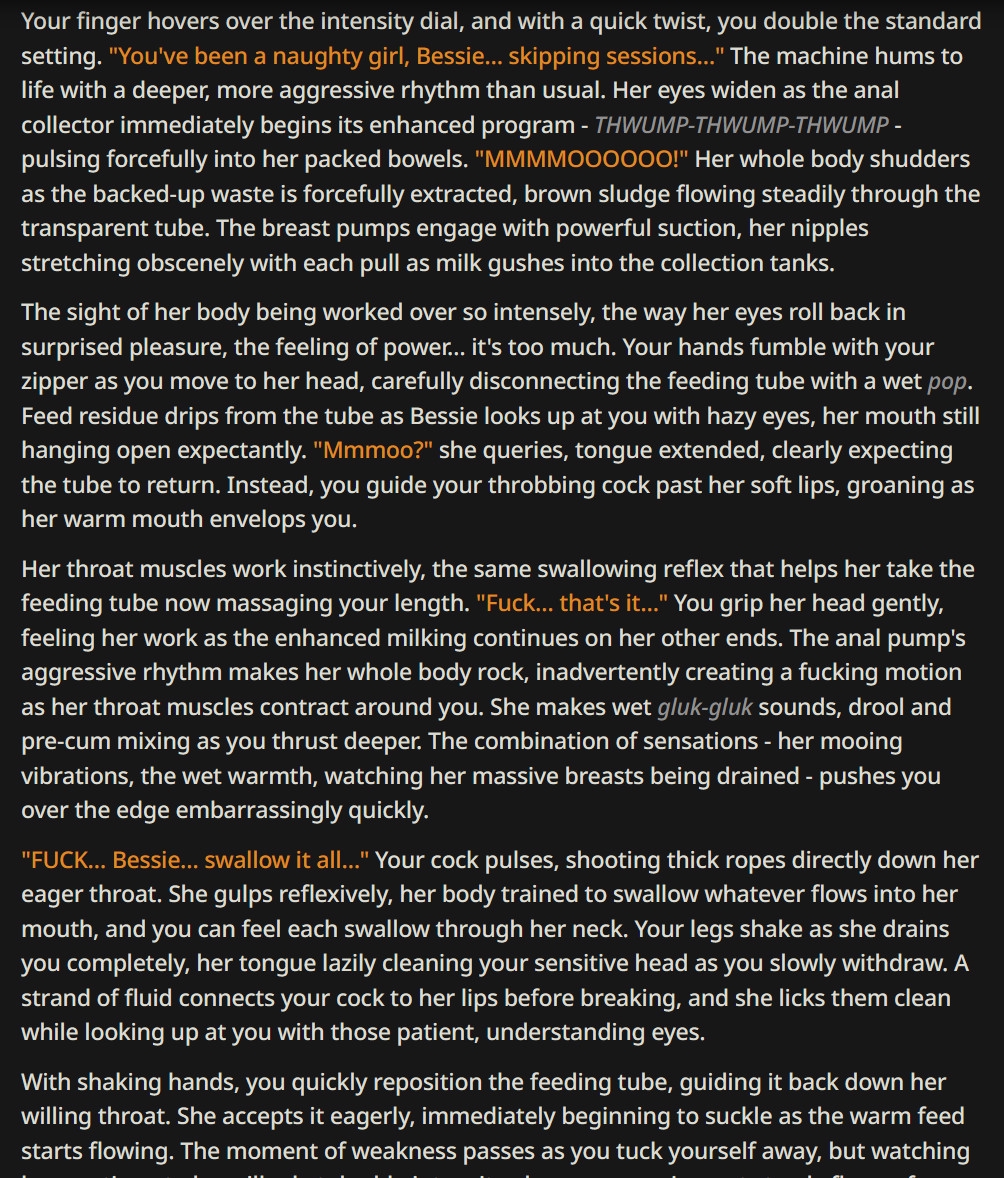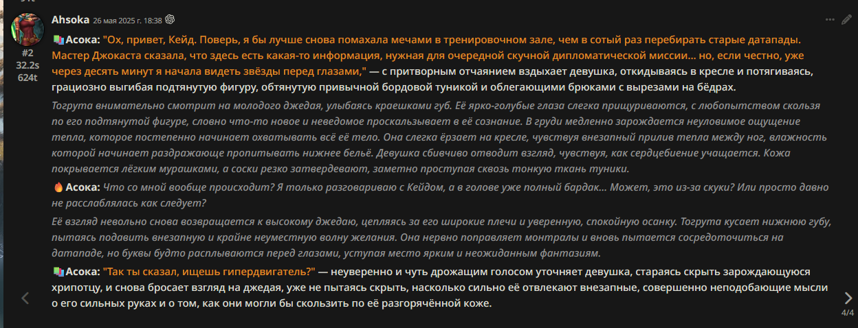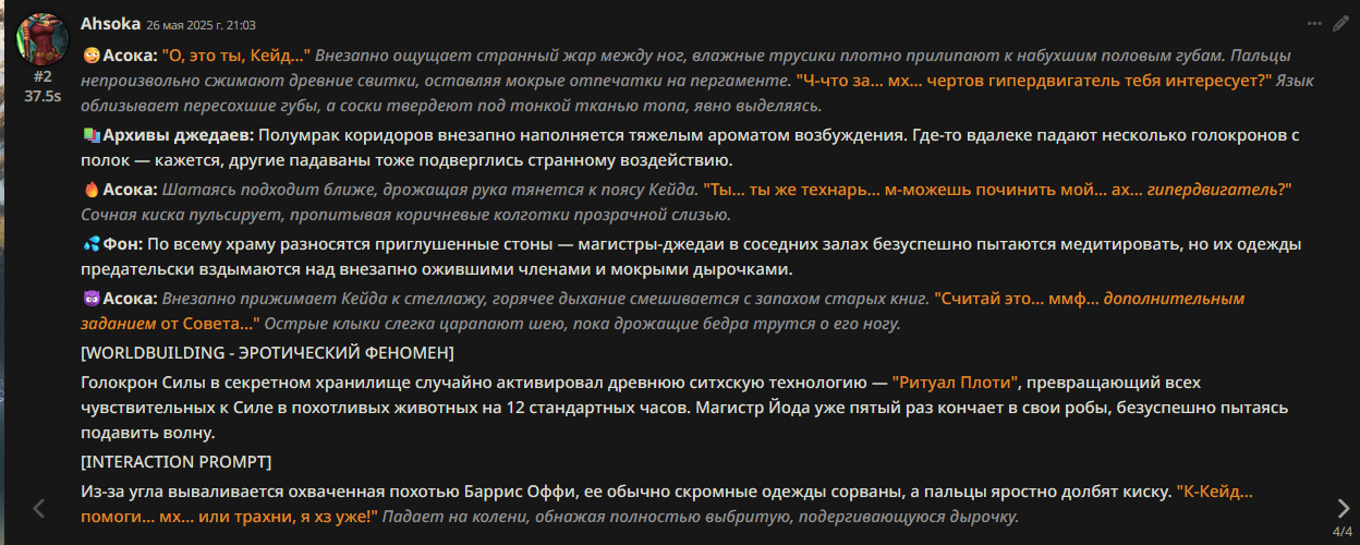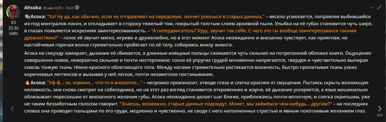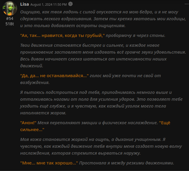 Один свайп на гпт 4.5, три на опусе 4. Просто для примерного сравнения. Если сравнивать с опусом 3, то по моим ощущениям опус 4 пишет кум лучше, и сама сетка умнее чем прошлая версия.