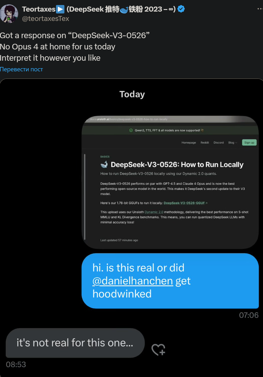 >>1216971 умник хуев, Unsloth делает кванты для локального запуска. Им часто дают модели заранее (то же самое было с Qwen 3). Если не знаешь, то молчи. Ясен хуй оригинальная модель дипсик будет в FP8, как и предыдущие. Просто как раз Unsloth и обосрались с тем, что кванты для не вышедшей модели уже заанонсили