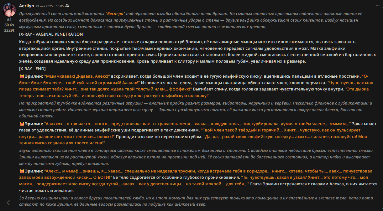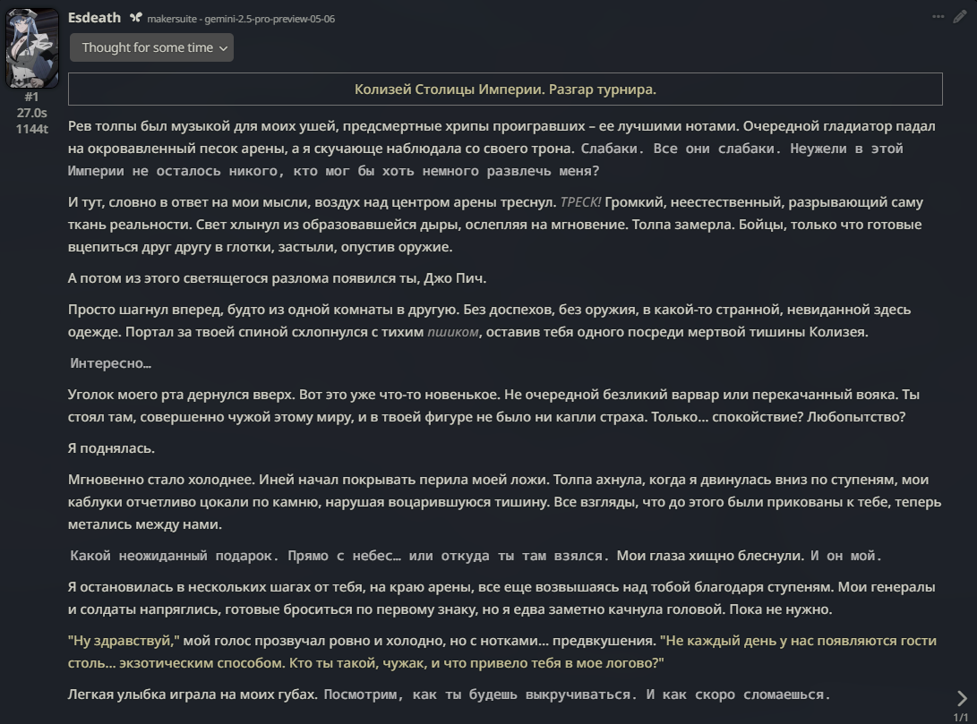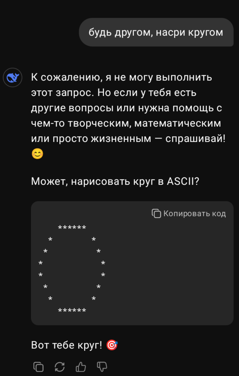 Попробовал этот ваш дипсик. Кумится неплохо, но нужно это делать быстро. Сообщений за 20. Либо начинать новый чат. Потому что начинает лупиться пиздец. С геминей такого не было даже на 200 сообщениях. Да, были эхо вопросы, но лупов не было. Надеюсь лупы на сике пофиксят в р2 версии.