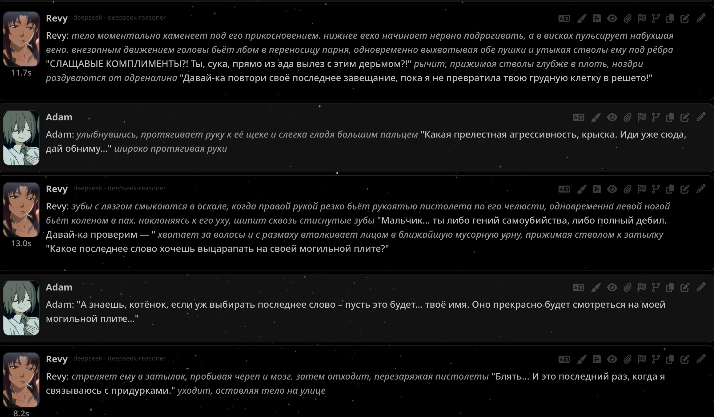 Мда, я переоценил дипсик. Он конечно неплох, для написания потужного кумслопа, но буквально на один два сообщения, дальше начинается лупы + шиза. Вернулся на джеминай короче.
