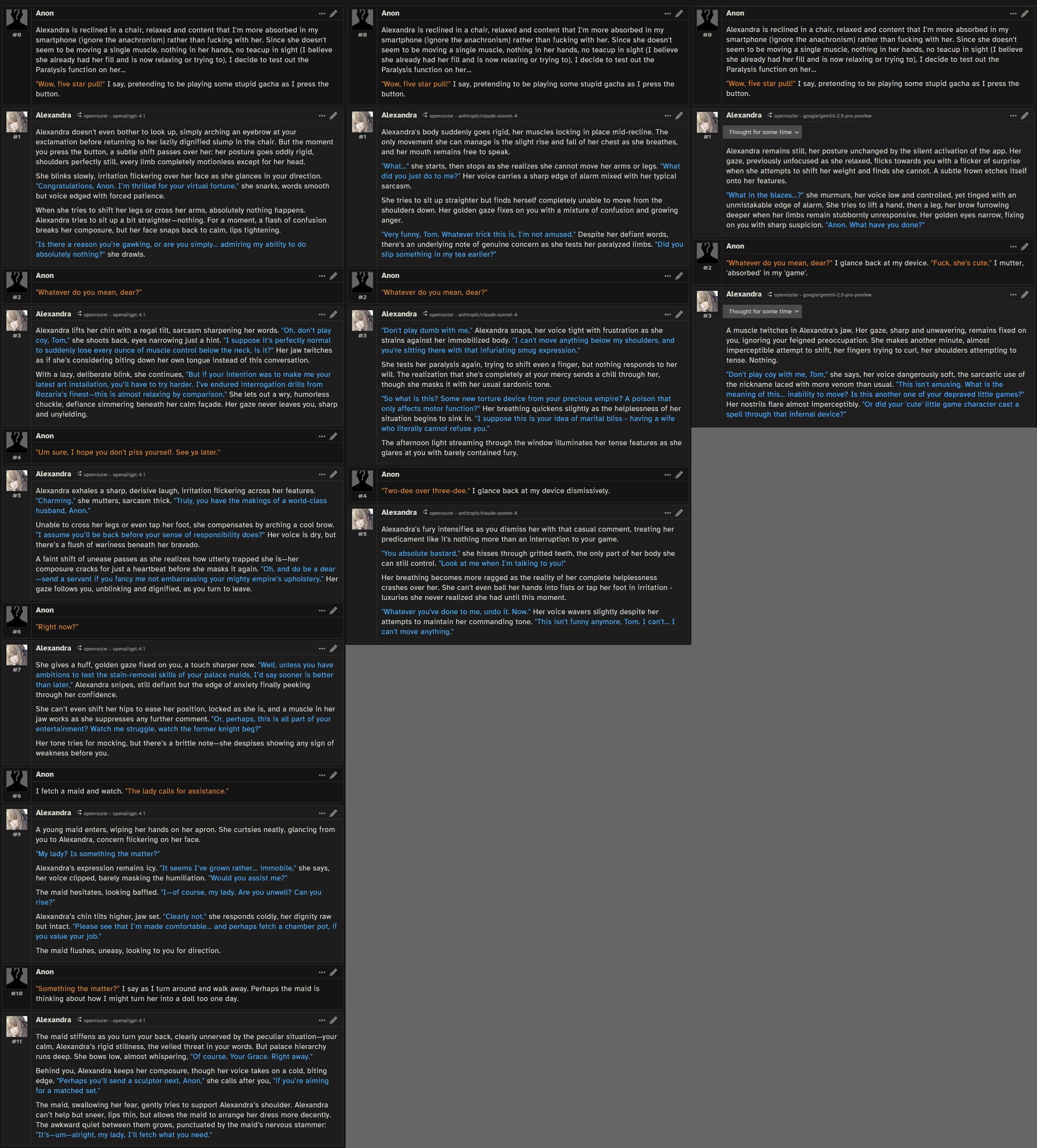 >>1217708 >>1217715 Ни одна современная сетка не может нормально отыграть всех персонажей. Гемини будет скатываться в одно клише, Клод в другое. Вот и все.