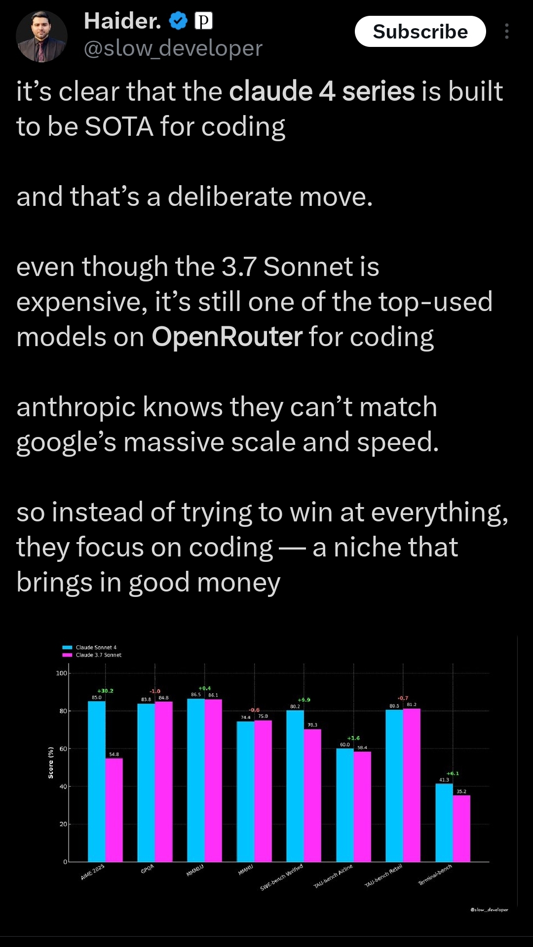 Он не то что бы говно - соннет 3.7 это даже до сих пор топовая сетка по кодингу. Больше интересно, какого хуя у них получился регресс по всем параметрам в четвёрке, контора не то что бы некомпетентная. И какого хуя они это назвали четвёркой. Может быть они недотренили базовую четвёрку, в то время как у 3.7 было уже три итерации. Типа, выпускают фундаменталку и постепенно итерациями подгоняют.
