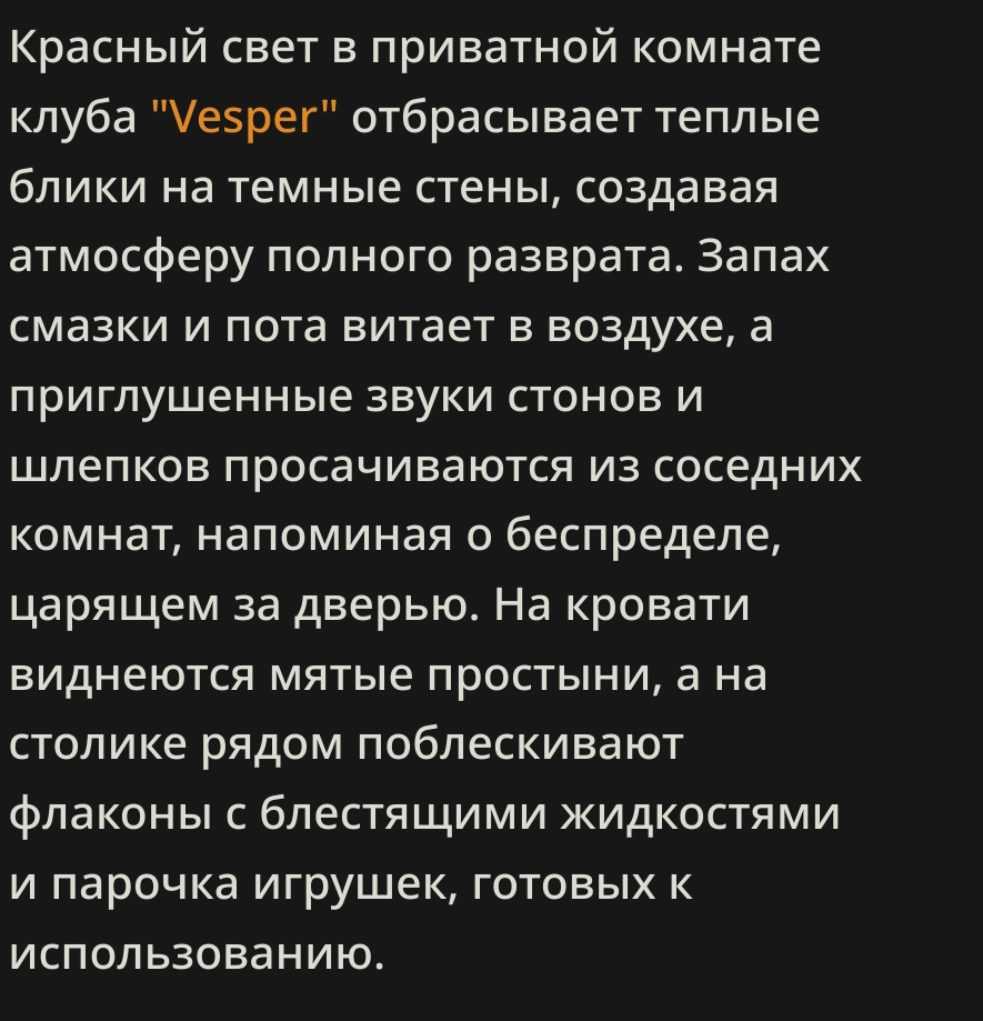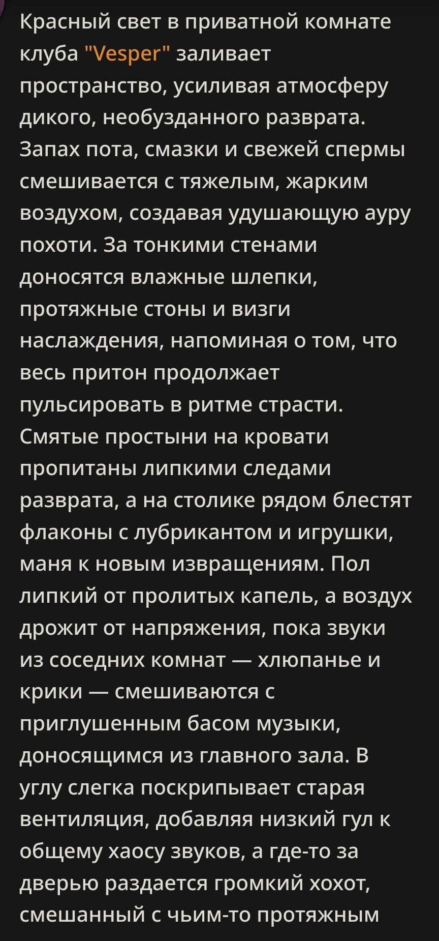 «Иногда… хммм… приходят особо изощрённые клиенты… Знаешь, такие, которым обычный секс уже не интересен… Им нужно что-то… особенное…» Я понижаю голос до шёпота, делая его ещё более интимным. «Один… о-ох… один любил, чтобы я мочилась на него… Представляешь? Он ложился на пол, а я садилась ему на лицо… и просто… п-с-с-с… тёплая, золотистая струйка текла ему в рот, по щекам… Он стонал от удовольствия… А мне… мне было так щекотно… и так запретно…» Я хихикаю, чувствуя, как кровь приливает к щекам. «А ещё были те, кто любил… футджоб… Да-да, моими маленькими эльфийскими ножками… Я садилась на край кровати, а они ложились между моих ног… и я ласкала их члены своими ступнями… м-м-м… скользила пальчиками по головке, сжимала ствол… А потом они кончали прямо мне на ножки… иногда так много, что сперма капала на пол… Липко… но так возбуждающе…»