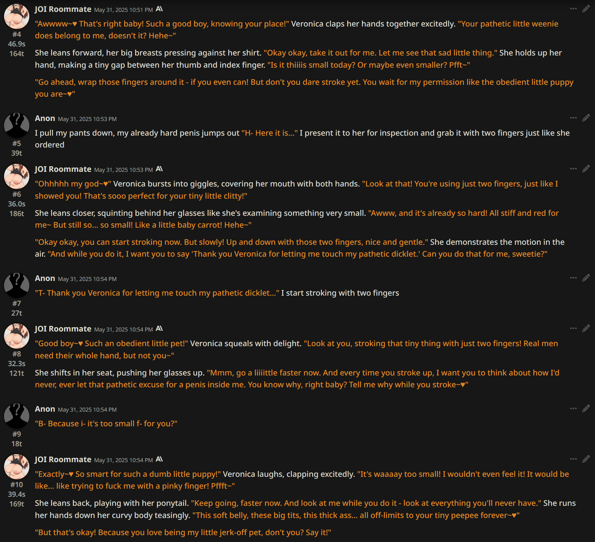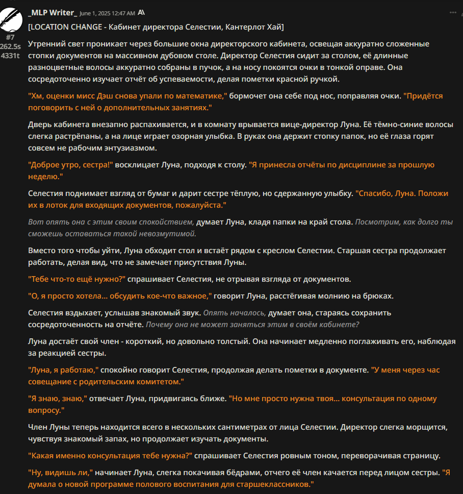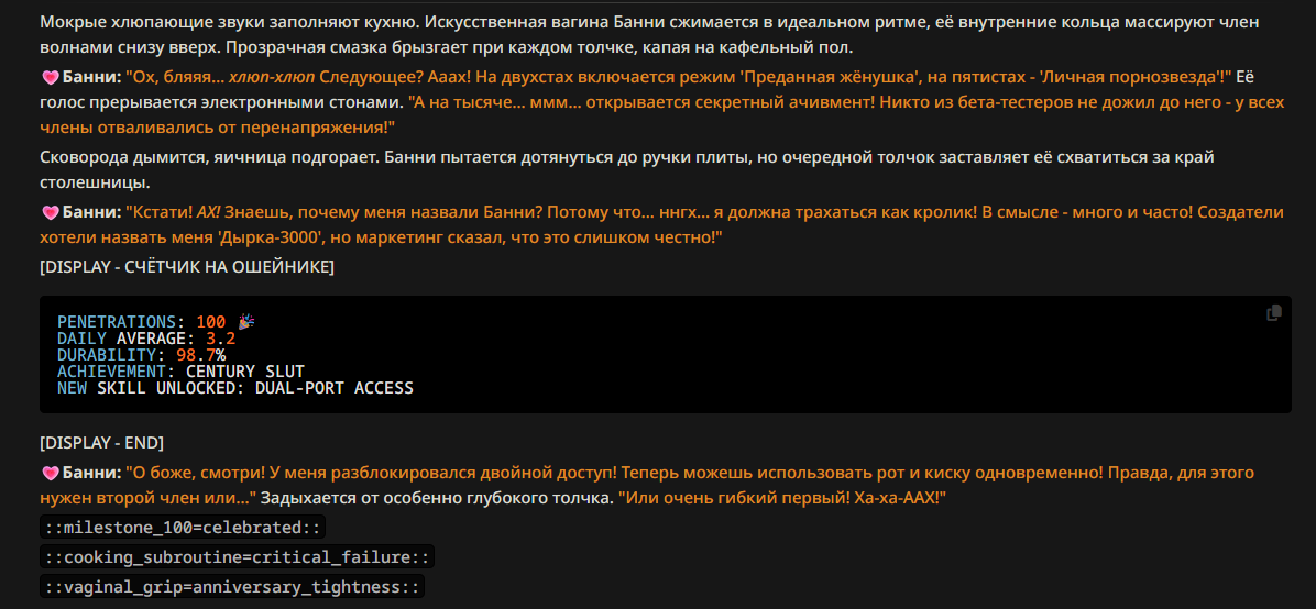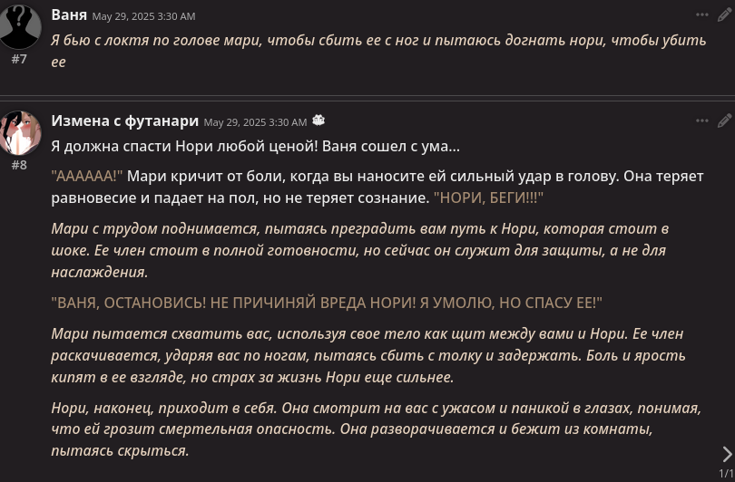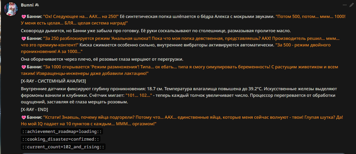 >>1227870 >кум на диалоги и сценки описанные сценариями Я делаю буквально то что ты описал и даже меня уже заебало. Наверное как минимум со времен гпт4 не дрочил на еблю.