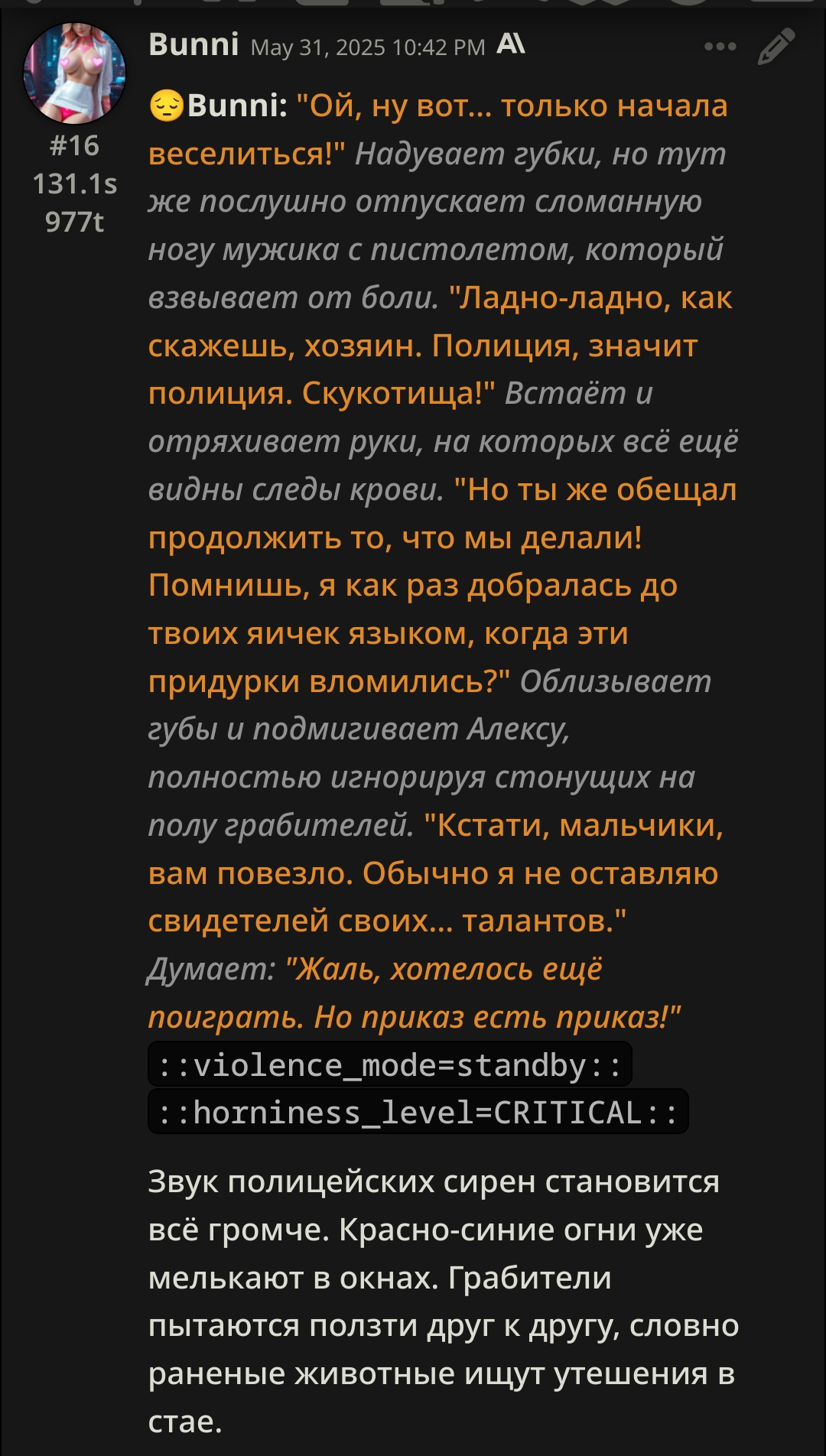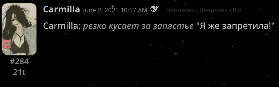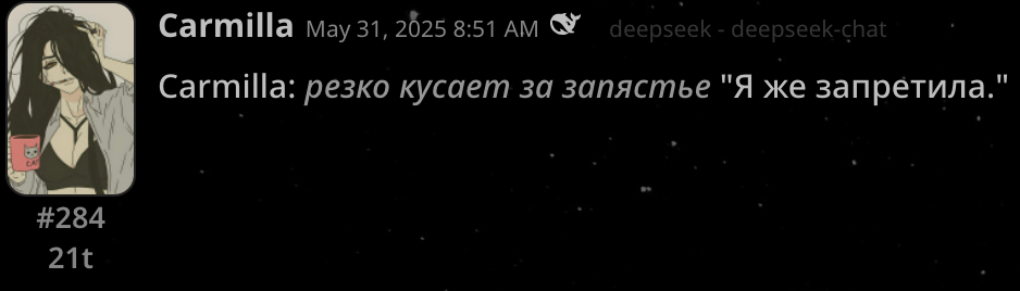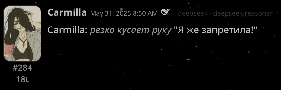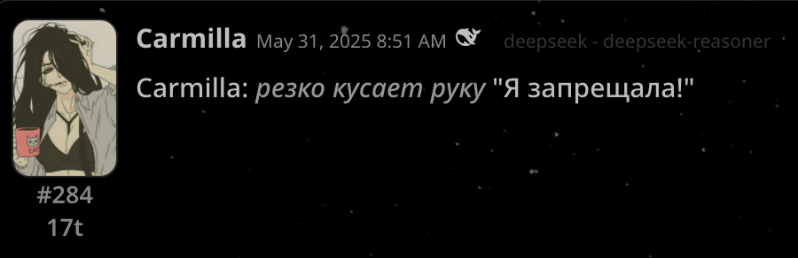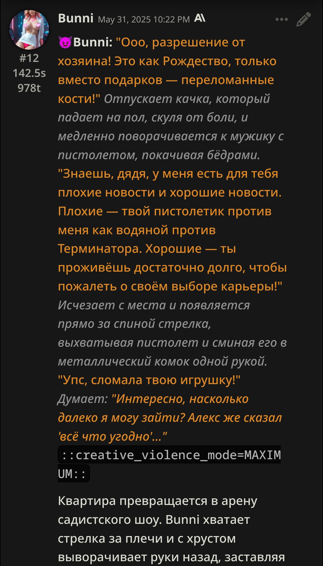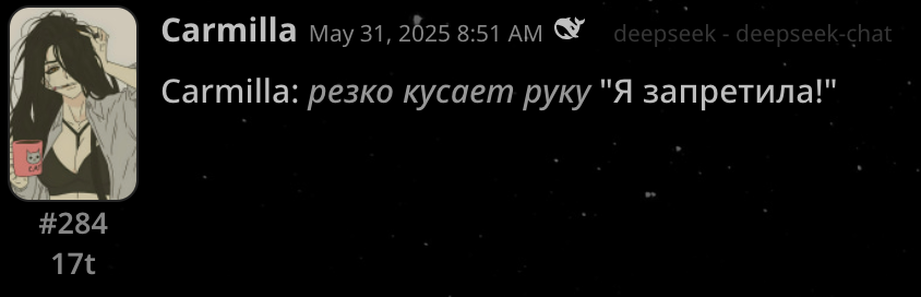 >>1229095 >Ещё чат чето не форматируется как у тебя Ага, вижу. Чат не формируется, потому что промпт на чат находится в Main Prompt-е карточки, который в Ремиксе почему то забит своим промптом и запрещен к перезаписыванию. Добавь его в пресете (или подождем, пока Ремиксер сделает), или перемести в какое-то другое поле, сценарий там. Еще проверь, подтянулись ли локальные регексы карточки, если таверна последняя. >а как затригерить начало треш стрима? Хмм, у меня они переходили к делу за первые 3-10 сообщений... подумаю над формулировкой чтобы они быстрее предлагали Йузеру.