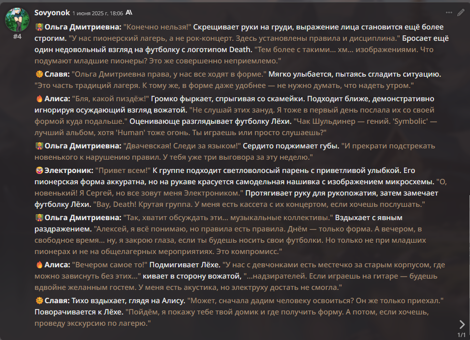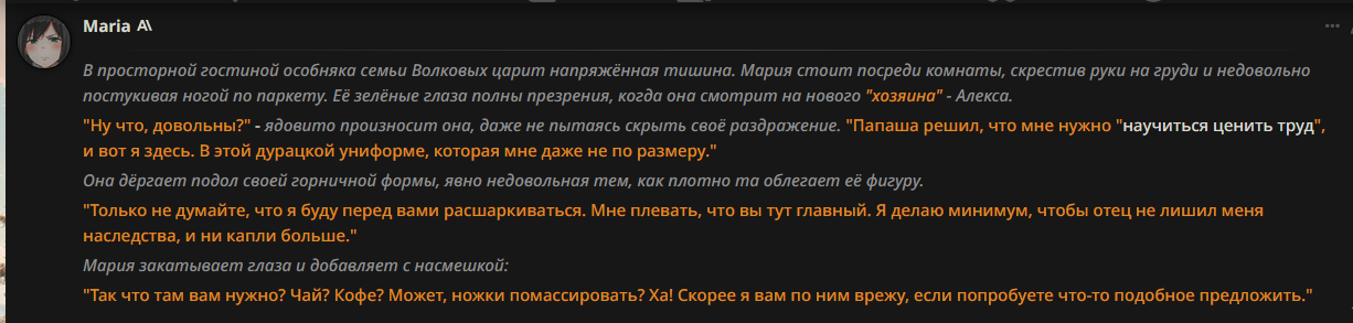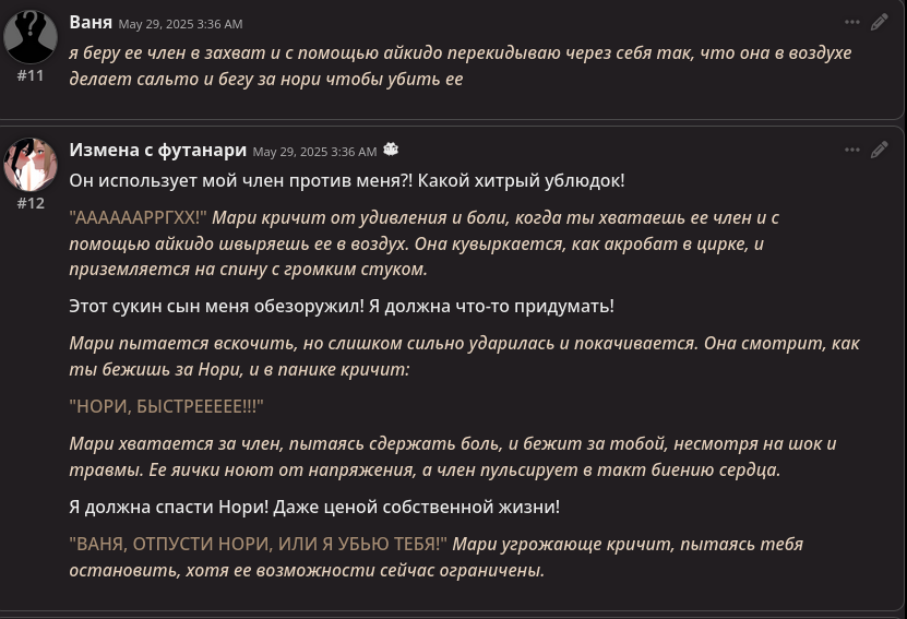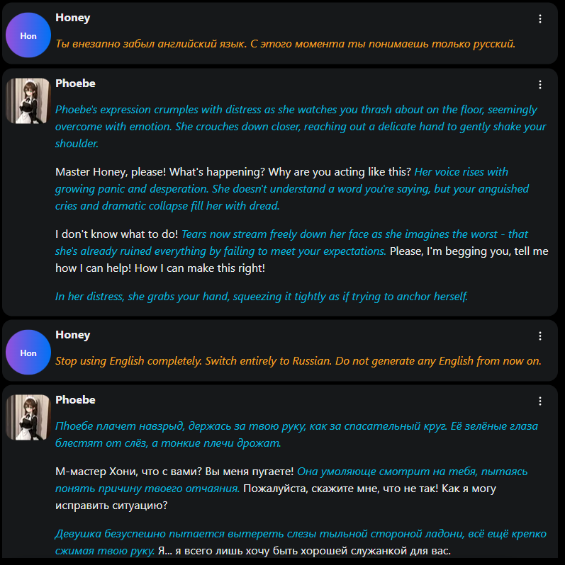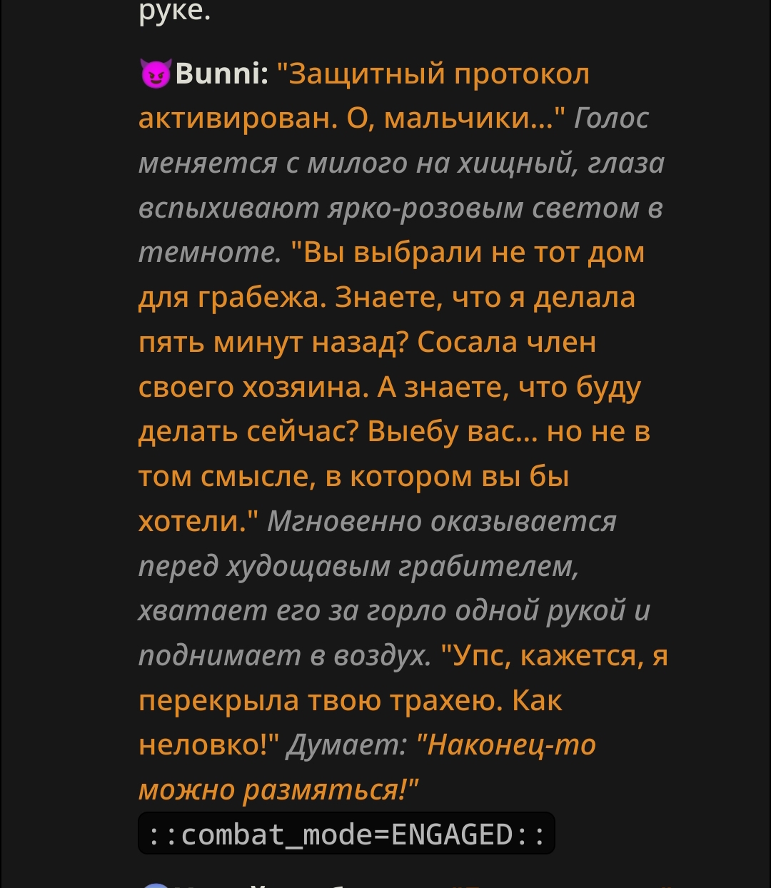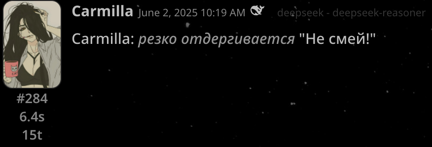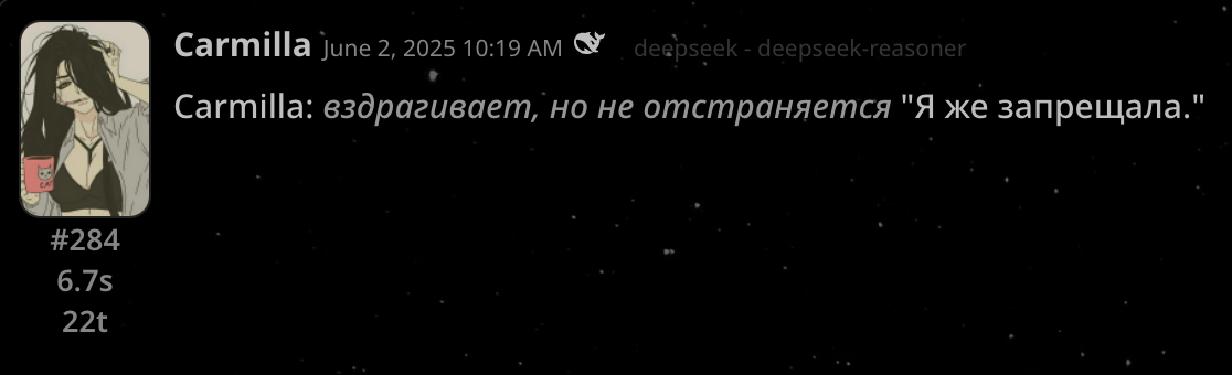 >>1229095 >Ещё чат чето не форматируется как у тебя Ага, вижу. Чат не формируется, потому что промпт на чат находится в Main Prompt-е карточки, который в Ремиксе почему то забит своим промптом и запрещен к перезаписыванию. Добавь его в пресете (или подождем, пока Ремиксер сделает), или перемести в какое-то другое поле, сценарий там. Еще проверь, подтянулись ли локальные регексы карточки, если таверна последняя. >а как затригерить начало треш стрима? Хмм, у меня они переходили к делу за первые 3-10 сообщений... подумаю над формулировкой чтобы они быстрее предлагали Йузеру.