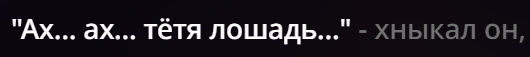 Скидываешь: >"Бля, пива бы." сказал Анон. Он встал и, почесывая пузо, пошел на кухню. "Эй, мне тоже возьми, дебил!" крикнула Машка ему в след, откусывая кусок бутера. Телевизор всё так же гудел, как фон их очередной перепалки.