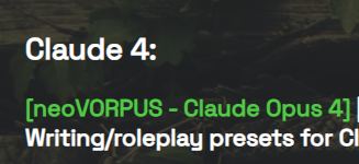 >>1228478 Вообще я посмотрел у него пресет для клода неплохой ничего лишнего не блоат удобно редачить. А когда я смотрел аорту я чота охуел от количества инструкций плацебных