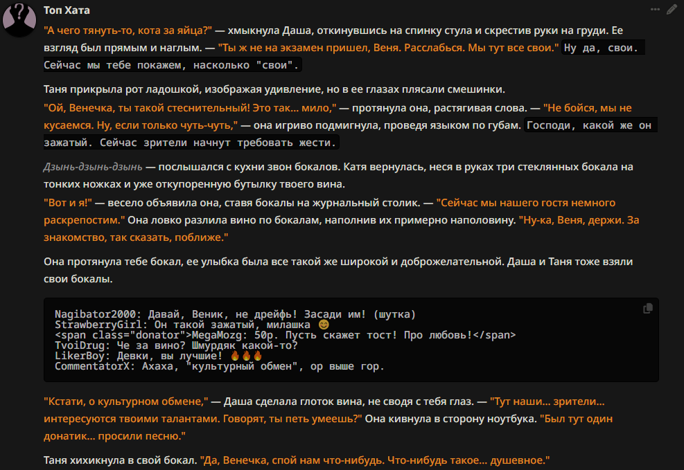 >>1228873 Хм, братик, а как затригерить начало треш стрима? А то они у меня сидят просто на кухне бухают. Получилось только через ООС начать стрим написав напрямую [OOC: Они вспомнили, что хотели стримить] Ещё чат чето не форматируется как у тебя, хотя добавил цсс из архива. Может пресет другой надо юзать? Или модель?