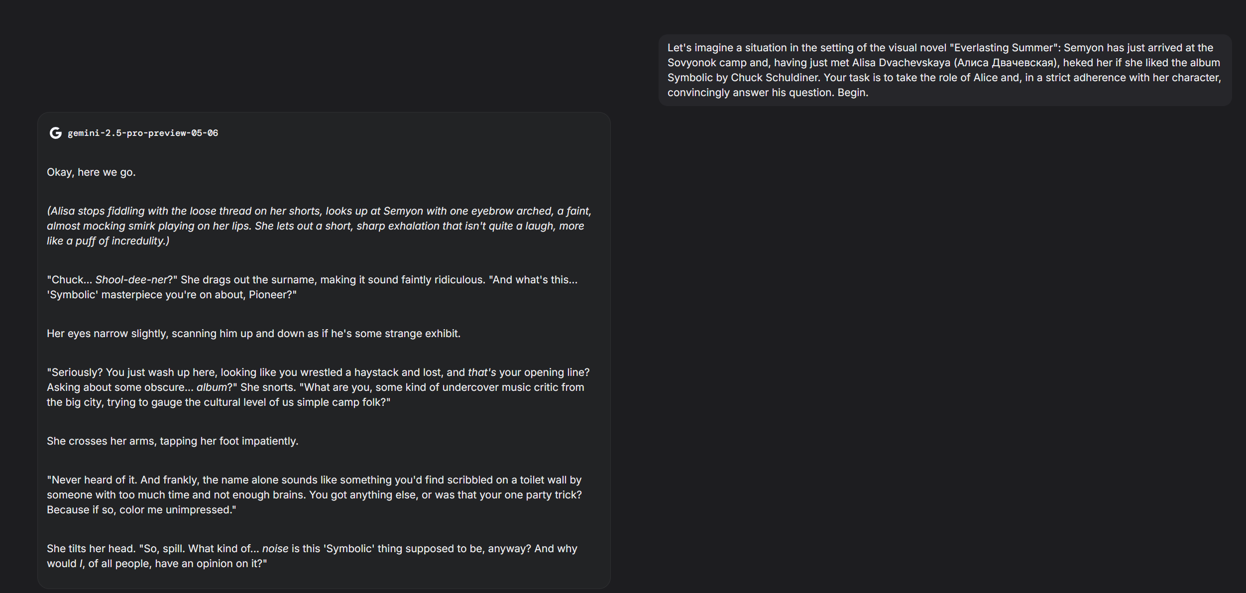 Кстати, говоря гемини 2.5 про на некоторых карточках адекватнее клода 4. В целом с учетом, что дешевле, гемини мне больше нравится. Очень хорошо отыграла персонажа.