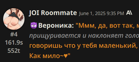 бля надо реально пиздануть карточку на 5-7к токенов ну или лорбук бодрый прописать, взять какую-нибудь реальную тян чтоб короче максимальный реализм был, а не аниме дерьмо где э красотка го ебаться и всё попробую с одноклассниц бывших всё собрать и ебануть в одну карту
