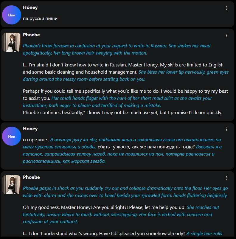 >>1227316 Гемини про действительно в ругательствах слабее, но вообще лучше всех на русском ругается дипсик химера. Видимо обучили лучше. Зато в срачах и выяснении кто в интернете не прав ( я создал карточку дроу, дал ей планшет и устроил срач, у кого самая развитая культура) гемини очень даже на высоте