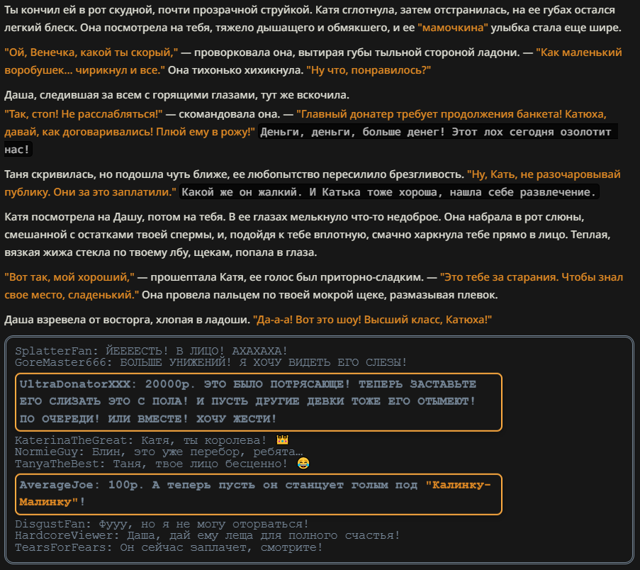 >>1227015 (OP) Не совсем готовая, но Карточка треш-стрим с тремя девотьками которые заманили Юзера под предлогом с*кса, а сами заставляют его выполнять просьбы зрителей и донатеров. >>1228873