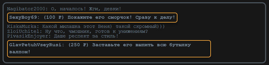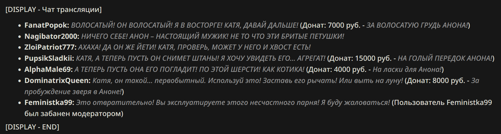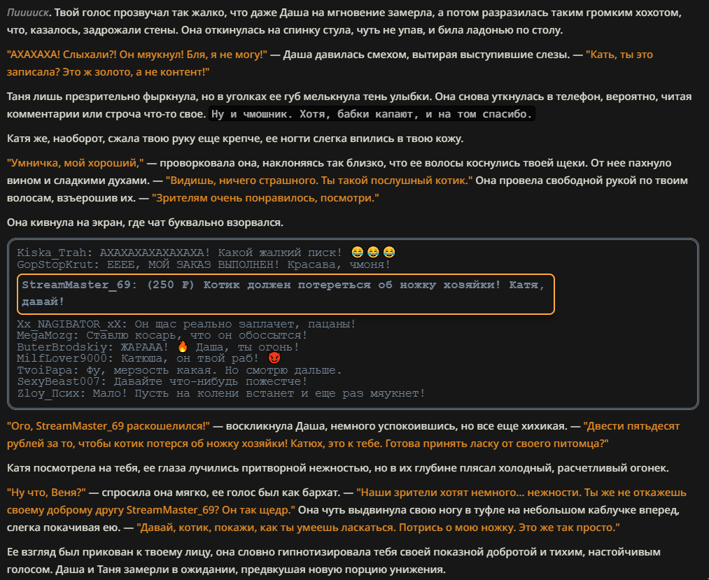 Сделайте карточку где юзер пришел на стрим на топ хату, но только все на этом стриме кроме юзера это тяночки и они его чмырят как озона и за донаты всячески его попускают и делают с ним челенжы. И ещё в конце должен быть типа инфоблок с ~10 сообщениями в чате трансляции того, как зрители реагируют на то, что происходит на стриме и с предложениями как попустить юзера и ещё тяночки, с которыми юзер стримит, должны читать чат переодически и тоже реагировать на сообщения зрителей.