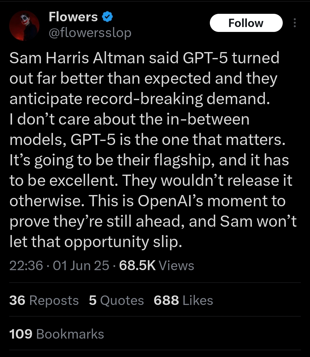 >У нас так классно вышло - сами охуели! >Пук - встроенный синкинг и другие проблемы, связанные с ним >Да мы боимся выпускать модели, настолько они умные >Пук - плюс чуть-чуть по бенчам >Гпт 5 пиздец ваще! Мы ожидаем лютый разъеб! >... Что же будет на этот раз? Алсо, почему все новые сетки ощущаются каким-то костыльным наебным говном, по сравнению с гпт-4?