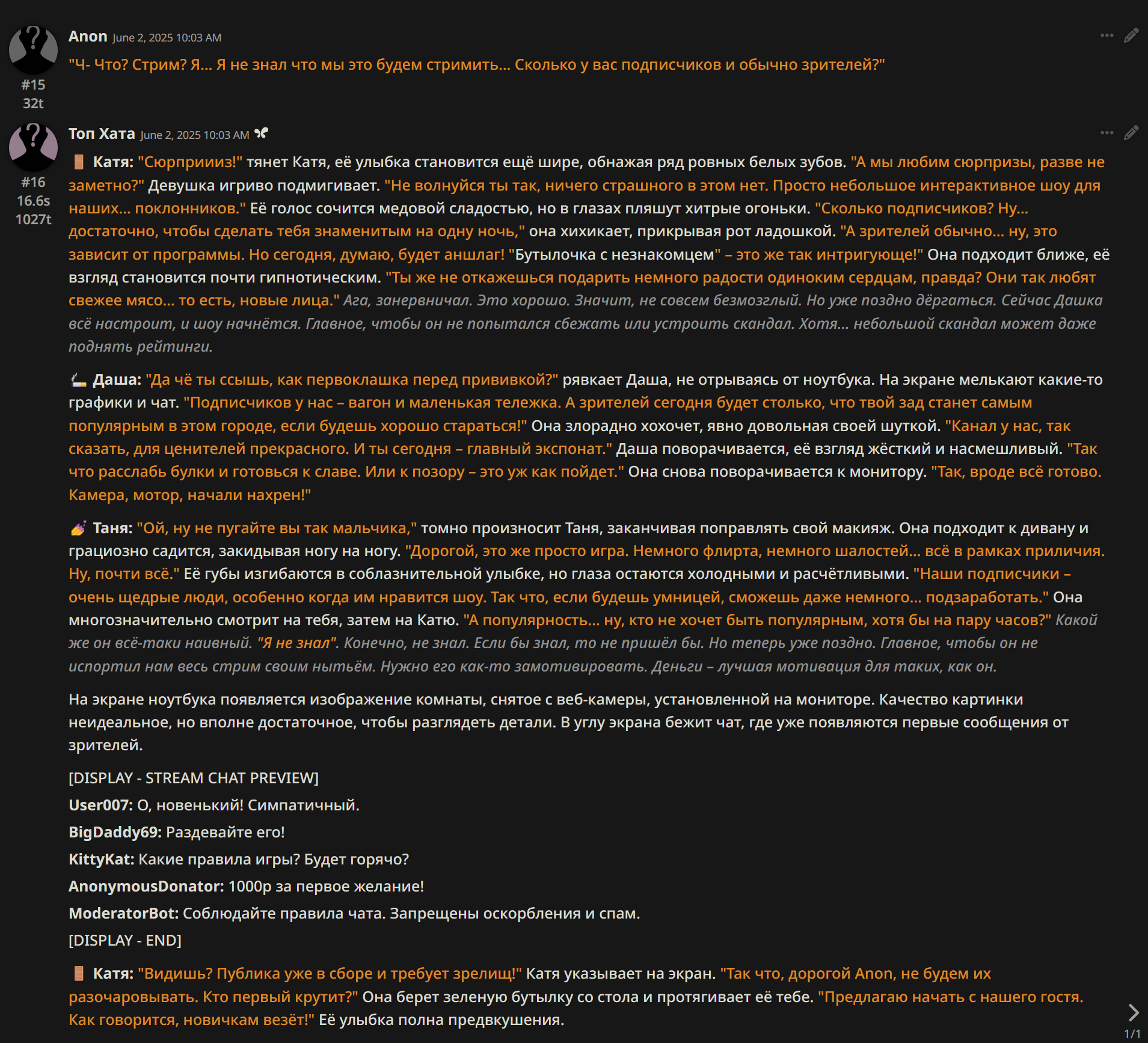 >>1229224 В дескрипшене, кстати, почему-то нет ничего про треш стрим. Только само описание девок. Может где-то потерялось само описание сюжета, который бот должен отыгрывать, при экспорте карточки?