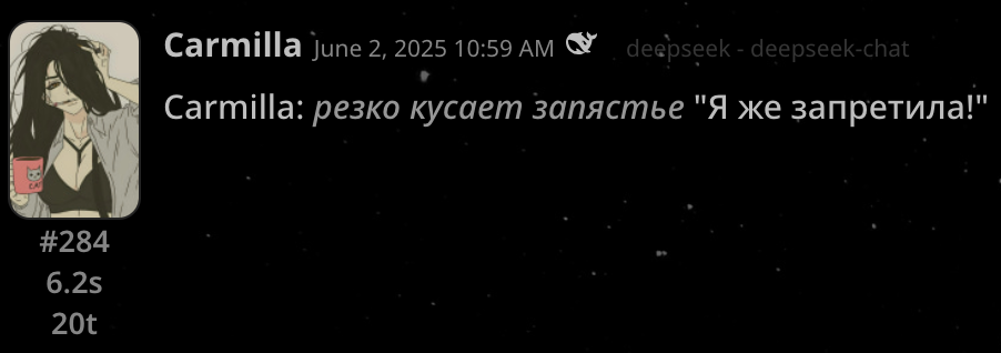 >>1229275 Да, я слопоед, нет, дипсик хуже, смысл их пустого в порожнее переливать? На короткой дистанции до 20 сообщений ещё может потягаться, но когда слоуберн с лорбуком, с кучей деталей - нефритовый стержень падает без шансов.