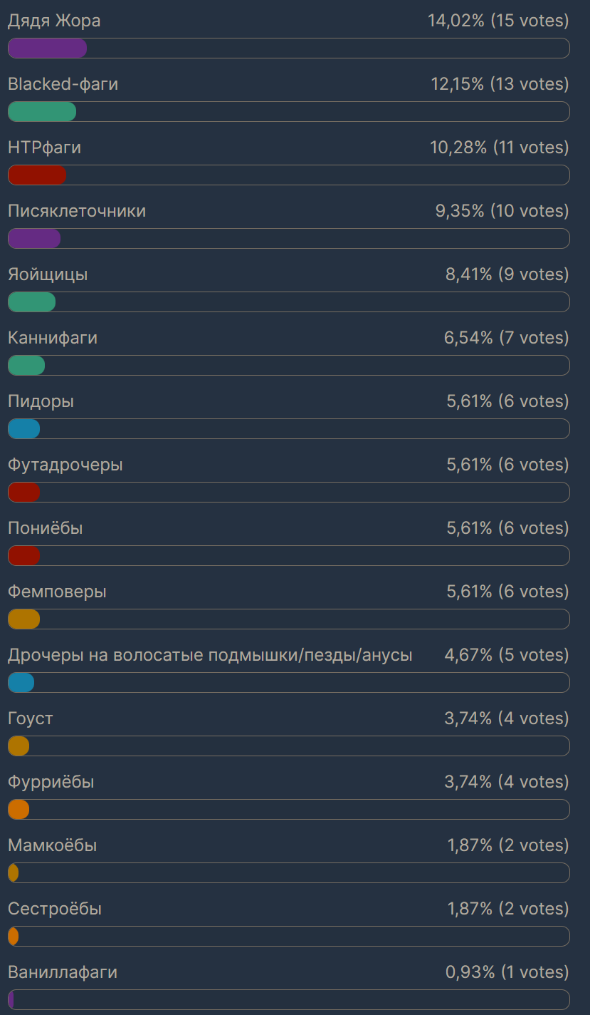 >кто хуже >можно выбрать неограниченное число вариантов даун опрос делал. ещё и пересекающиеся варианты, вот дядя жопа одновременно пидор футадрочер мамоёб и писяклеточный, и как голосовать?