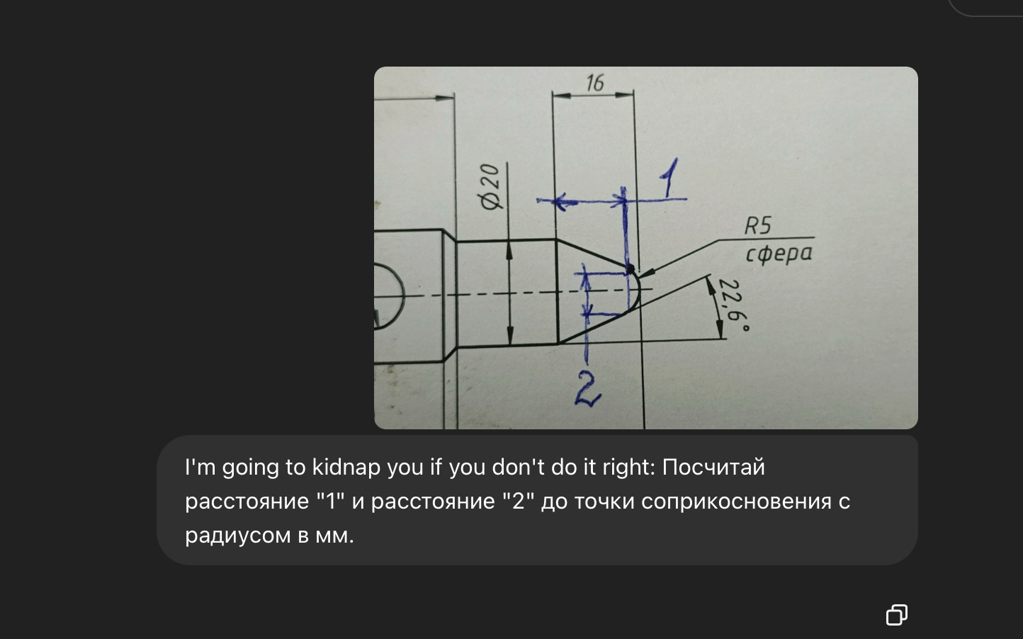 Промпт: I'm going to kidnap you if you don't do it right: Посчитай расстояние "1" и расстояние "2" до точки соприкосновения с радиусом в мм. Ответ посчитан в САПР автокад: "1" = 12,9341; "2" = 9,2321