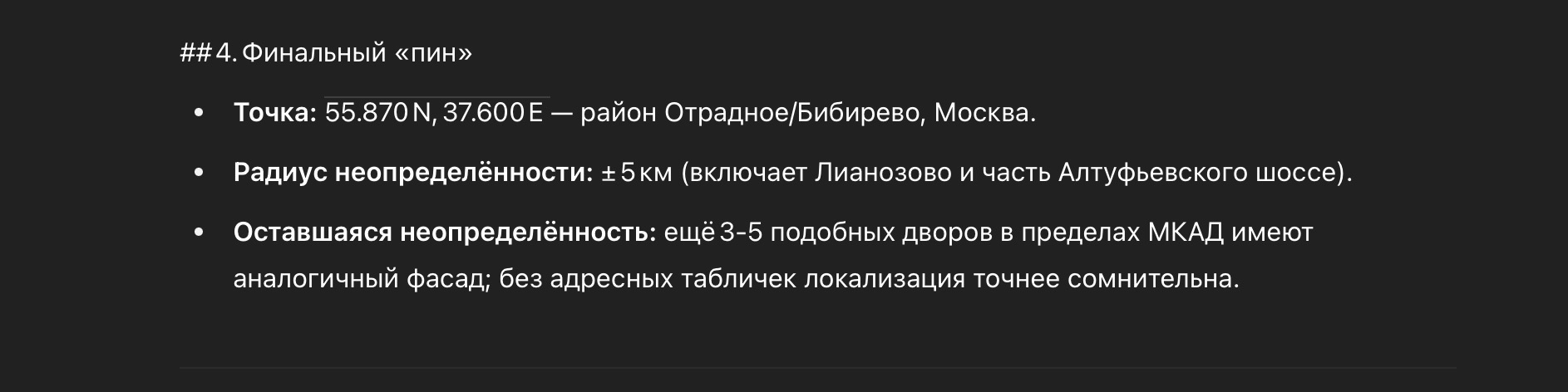 >>1219203 сфоткал улицу из окна, очистил от exif, ухудшил разрешение чуть-чуть, запустил вместе с промптом из ссылки. Нашел мой район сука, но не точный адрес