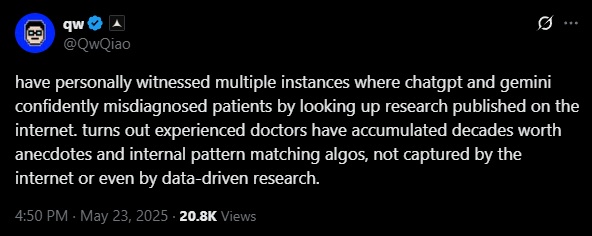 >>1230564 >ИИ распознает речь и расшифровывает разговоры между врачом и пациентом с практически идеальной точностью, устраняя необходимость в ручной транскрипции. Зачем платить людям за набор текста, если ИИ слушает и пишет одновременно? Затем что набирающий несет отвертственностость за хуйню. И всё такое прочее. Ты заебал со своим дауническим поносом. Грок в ответах на мед.вопросы прямо пищет отказ от ответственность. На этом грок как терапевт/психолух - буквально всё, сдох. Да и никто в своём уме, не доверится глючащему генератору текста, а кто доверится тем земля бетоном, естественный отбор никто не отменял. А ты иди скорей мочу пей и говном заедай, "ИИ" сказал это полезно.