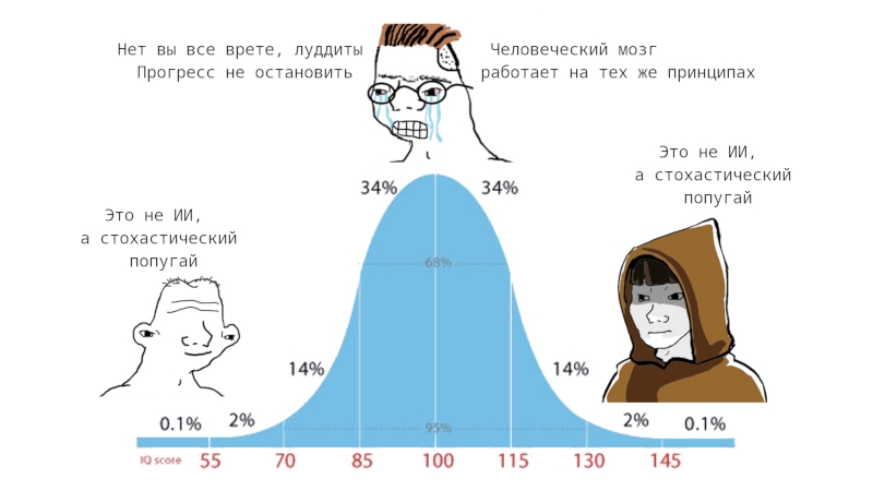 >>1230778 Кто тебе сказал, что я не понимаю значение этого слова? >115-125 105-115, я бы сказал. Ровно столько, чтобы иметь тягу к тому чтобы рассуждать на тему ИИ, но не достаточно для того чтобы высказывать какие-то дельные мысли по теме. Абсолютно точное определение мидвитов ИТТ.