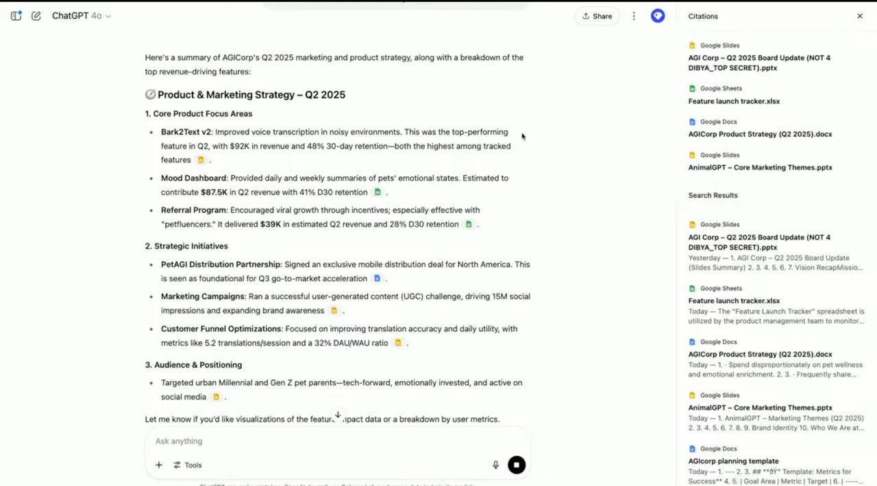 Подсоединить к ChatGPT можно Google Drive, Dropbox, SharePoint, Box, OneDrive и другие сервисы. По этим данным можно будет осуществлять поиск, Deep Reserch, ну или просто обрабатывать как хотите.