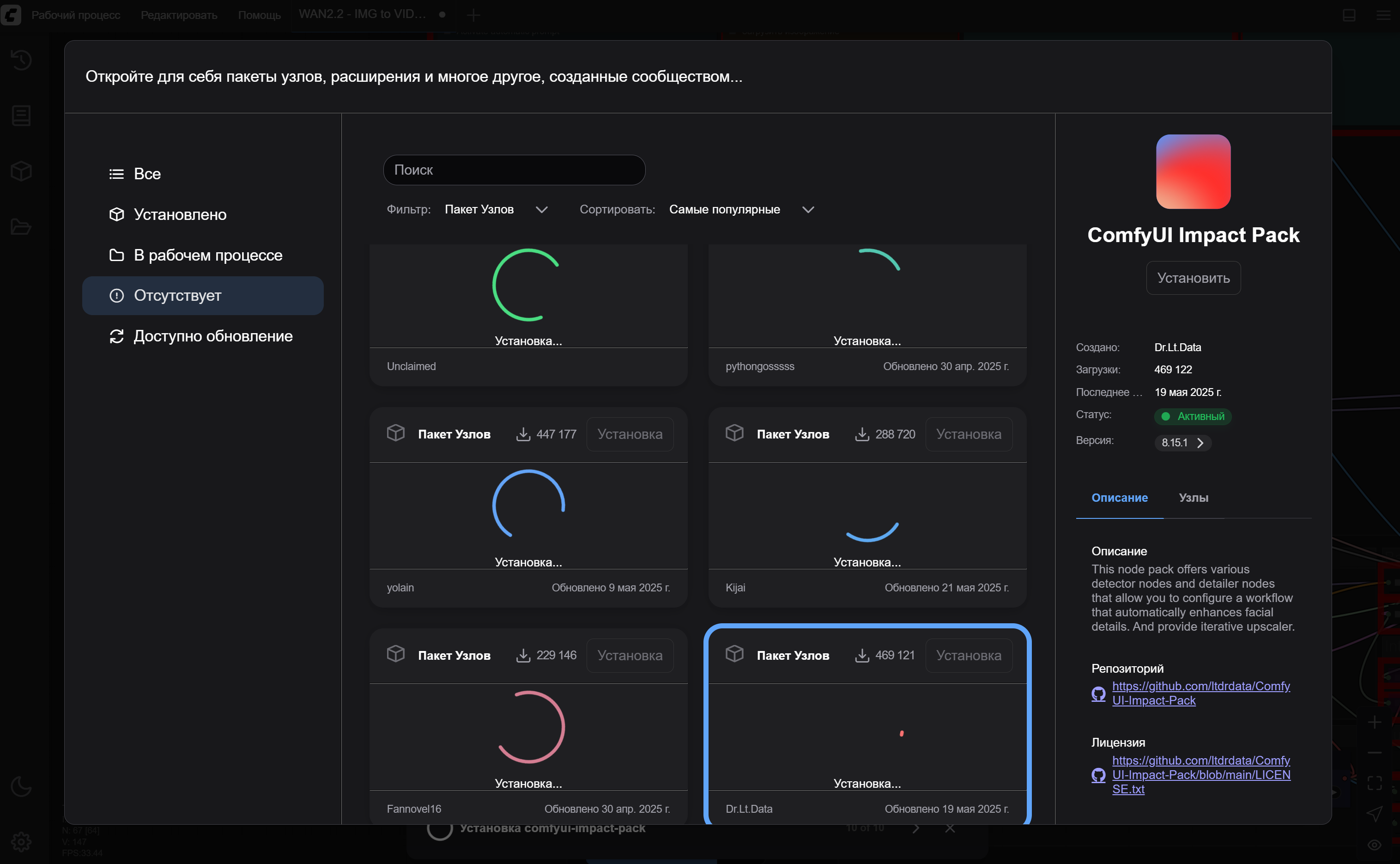 Вообще, хоть и скачал всего лишь вчера, попробовал обновить - в итоге он теперь при импорте воркфлоу хоть и показывает чего не хватает, но больше не предлагает это докчать. Перерыл везде - вообще нет такой возможности больше. Я ебал. Попробую вкатиться в другой раз, слишком жопа сгорела. Спасибо ещё раз за ответы и помощь (всё записал на будущее).