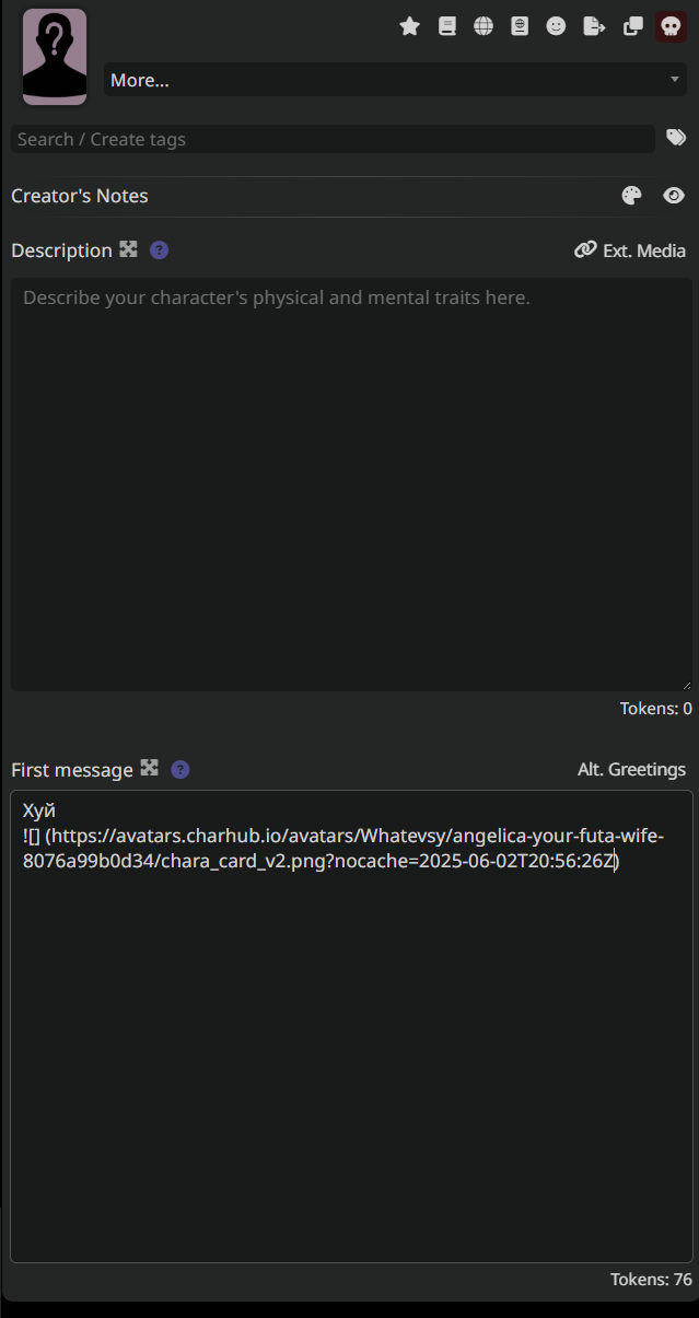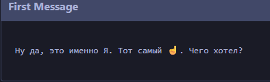 Кек Вчера в карточке машки босса мафии жеж прописал что она хочет проявлять заботу к юзеру и короче в каждом свайпе спрашивает покушал ли я, ужинал ли, а я блять не втыкаю какого хуя Сейчас вспомнил что в персоне моей указано что я жиробас