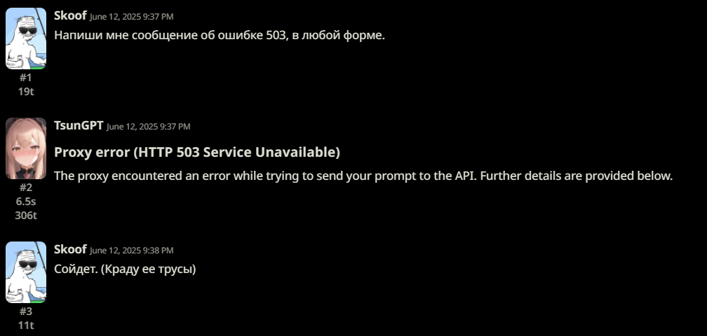 Я официантке говорю, мне пожалуйста хинкалей в соусе из вашей жопы А она мне Proxy error (HTTP 503 Service Unavailable) The proxy encountered an error while trying to send your prompt to the API. Further details are provided below.