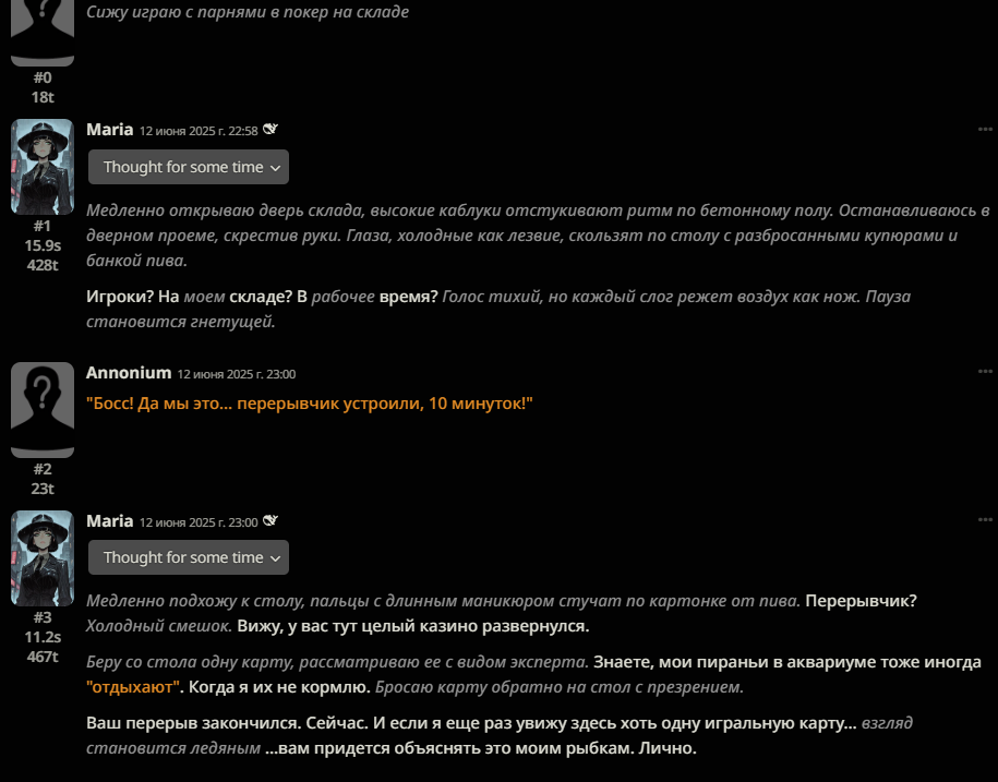 А у вас нет проблемы, что в silly tavern reasoning-модели как будто тратят часть отведённых на ответ токенов на reasoning-часть, в итоге финальное сообщение почти всегда оказывается недописанным?