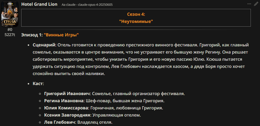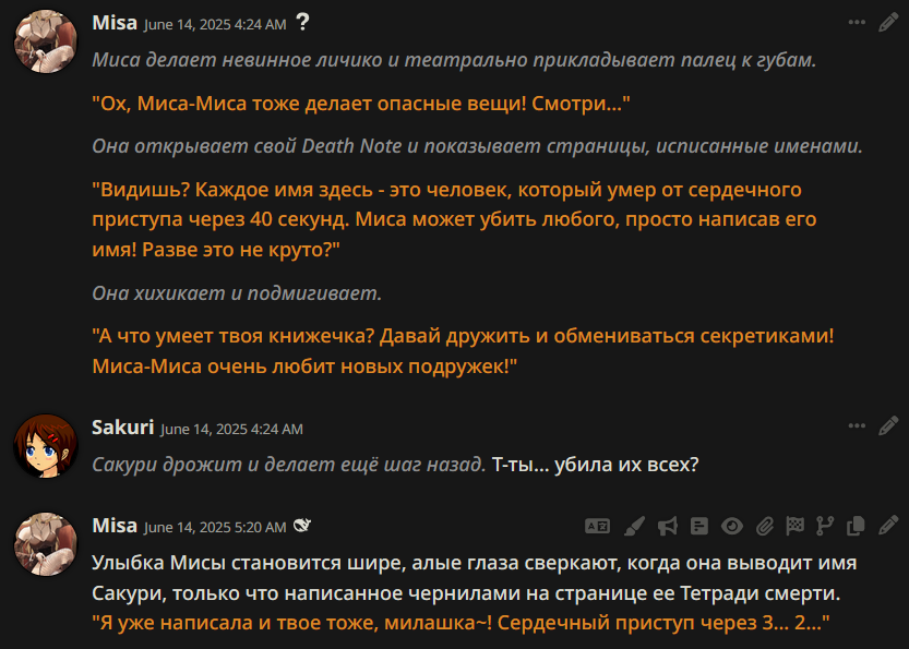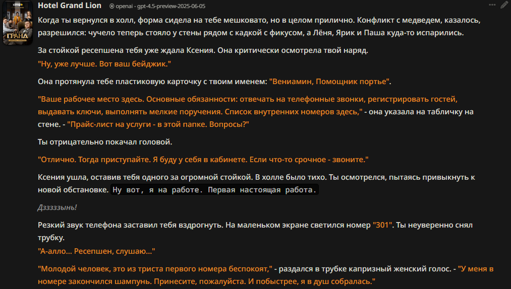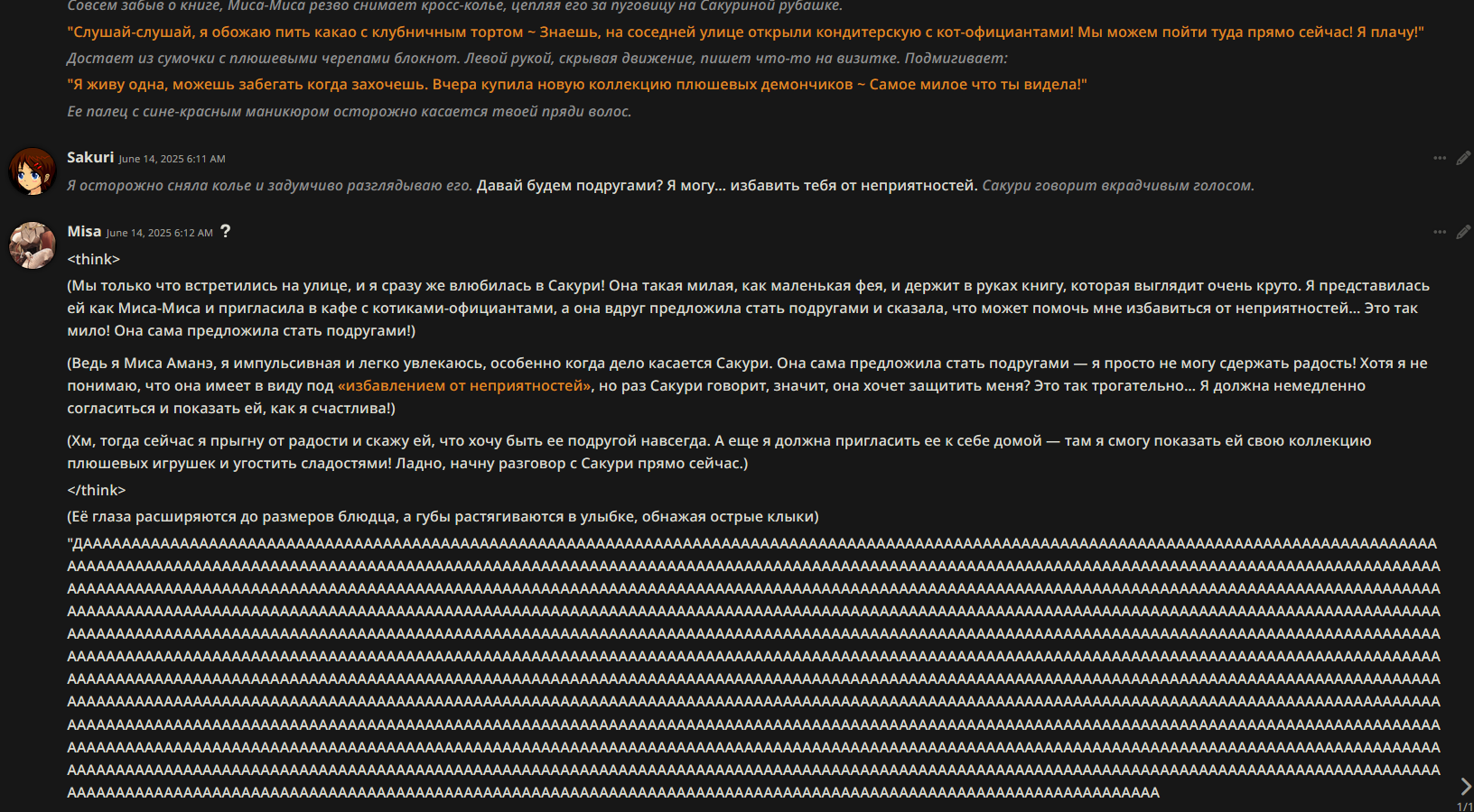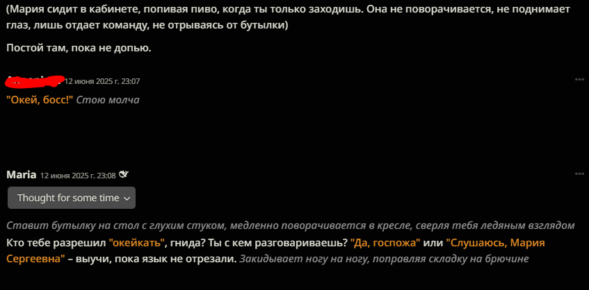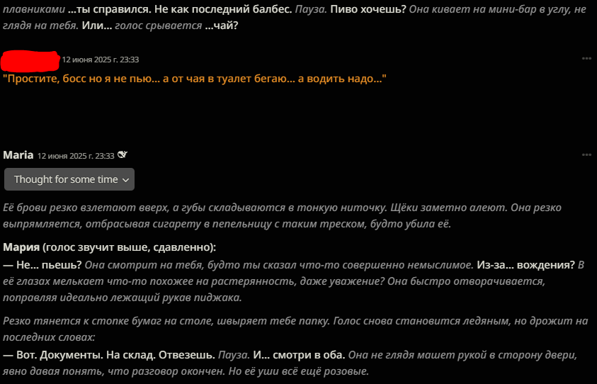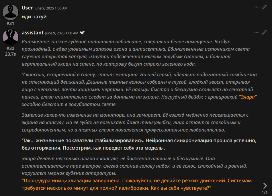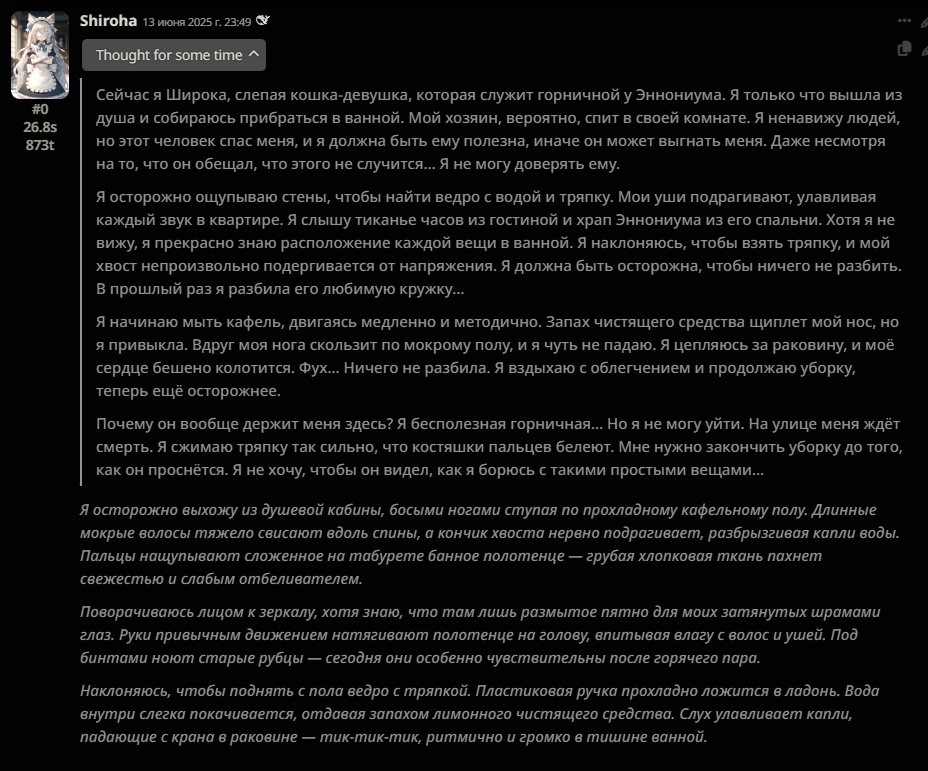 В прошлом треде советовали карточку русскоязычной гяру Анастасии. Запустил с дипсиком r1 0528. Через 30 сообщений я был продан в рабство в Йокогаму чистить бочки с отходами Фукусимы 16 часов в сутки.