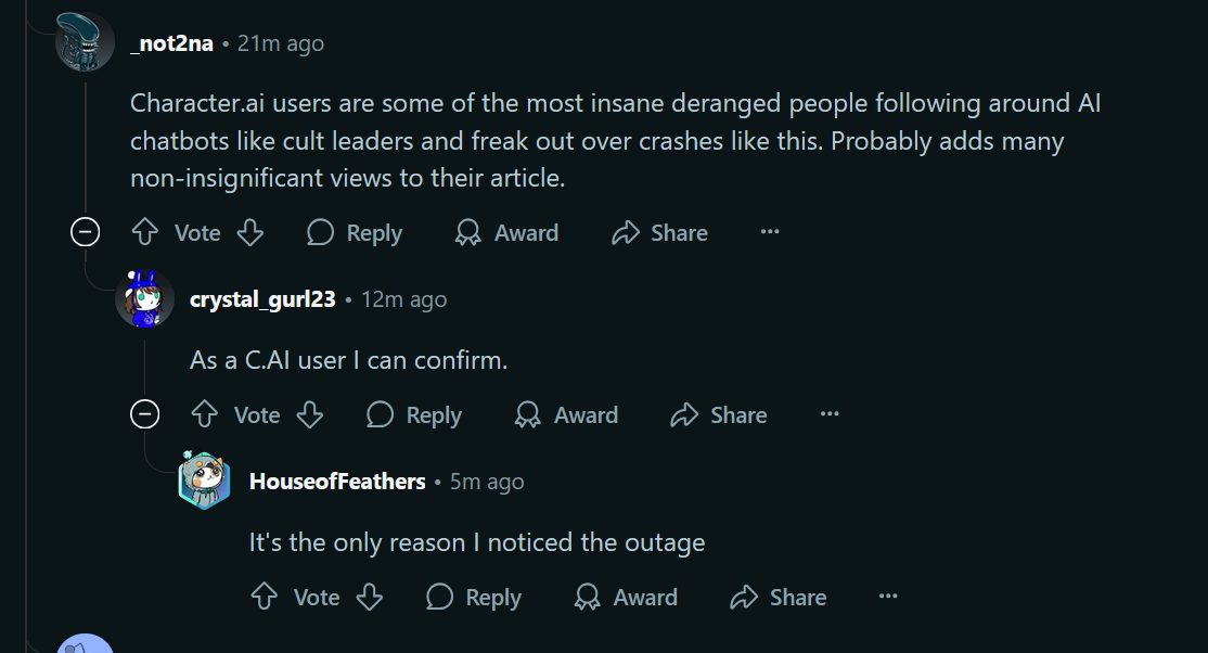 >>1243823 Кстати, в чайной ещё не самая невменяемая публика. Там же нет порнушных чатов и они блокируются - там просто челы общаются с своей AI girlfriend. (да, они ебанутые и ненормальные, но до aicg еще далеко).