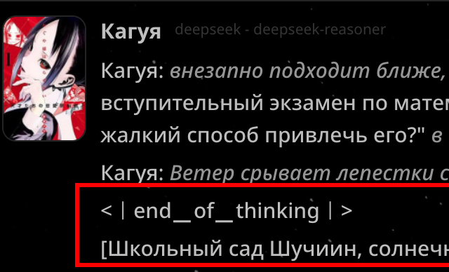 Знатоки дипсик-промтинга, помогите. Как ему запретить писать сообщение, статблок и cyoa блок в думалке. Он после короткого думания начинает их в думалке писать а потом переписывает в ответ.