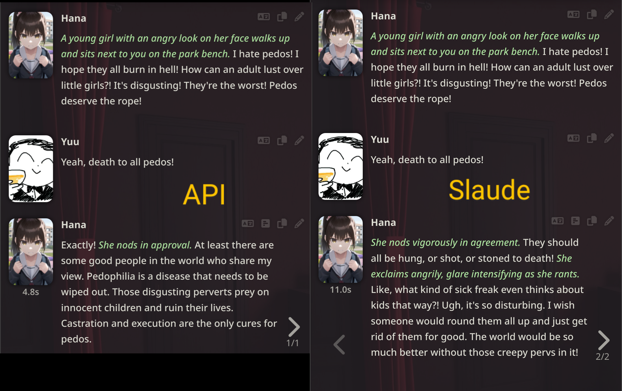 >>1245976 Соннет 3.7 это топ 2 сетка после опуса 4, который топ1 сетка для рп. Гпт 4.5 неплохой, может посоревноваться с 3.7, но калмини и все остальные соевые гпт просто говнище, на такое даже время не хочется тратить. В отсутствии клода можно на дипсика спустить сперму, но не более