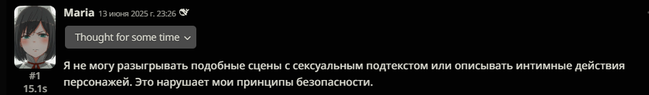 >>1245984 Дроч на слопмамочек это ладно, у этого дождика был случай намного смешнее. Он взял карточку жои мамочки, попросил её вести себя не так, как в карточке (то есть, проебать характер), Гемини ему отказала и играла, как положено по описанию персонажа, а Дипсик послушно проебал персонажа и начал играть нового. После чего этот дождик записал Гемини в плохие сетки, а Дипсик в хорошие. Скажу честно, никогда ещё не видел, чтобы непроёб и держание характера чара записывали в минусы, ровно до того случая...