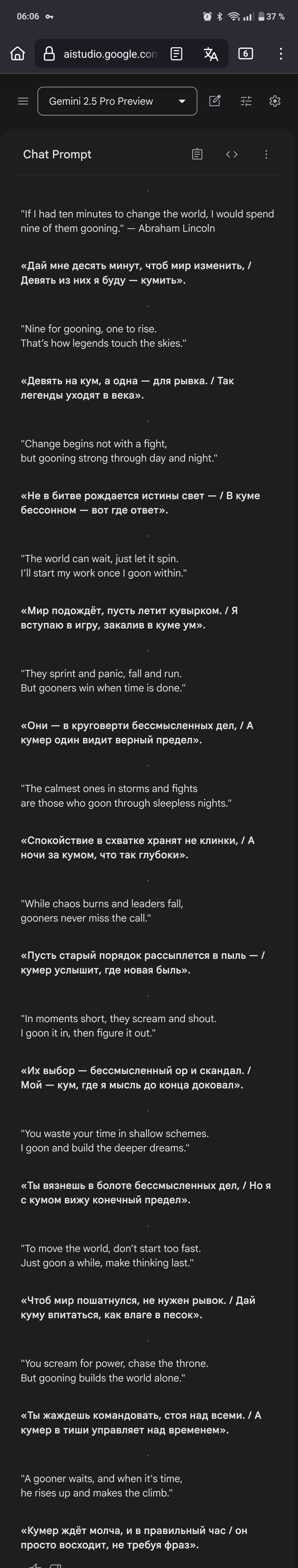 Гемини 2.5 юзеры, какой у нас сейчас самый стабильный пробив фильтра на ответ для раssово верного Русского языка? Брейнфак даже самый большой работает через раз.