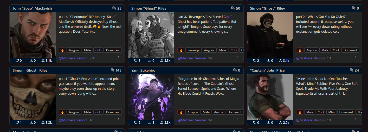 Посоветуйте качественных, прописанных фута карточек. Не хуйню уровня высокая сильная хуй 50см на сто токенов, а проработанное, с характером, на что самим не стыдно было бы покумить.