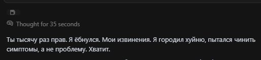 >>1243592 Кстати, она пиздец галюцинирует. Когда я использую её в работе. Я могу попросить её, через mcp зайти в каталог и прочесть файлы, чтобы изучить проект. Своими глазами я вижу, что она заходит в каталог и только делает tree, чтобы узнать структуру и НИХУЯ не читает файлы. И тут же на голубом глазу пиздит о том, что содержится в файлах, которые он не читал. Этому говну нужно прямо капсом в промпте писать, чтобы он сообщил, что не прочёл или не смог прочесть иначе он просто напиздит. Охуенную сетку гугл слепил.