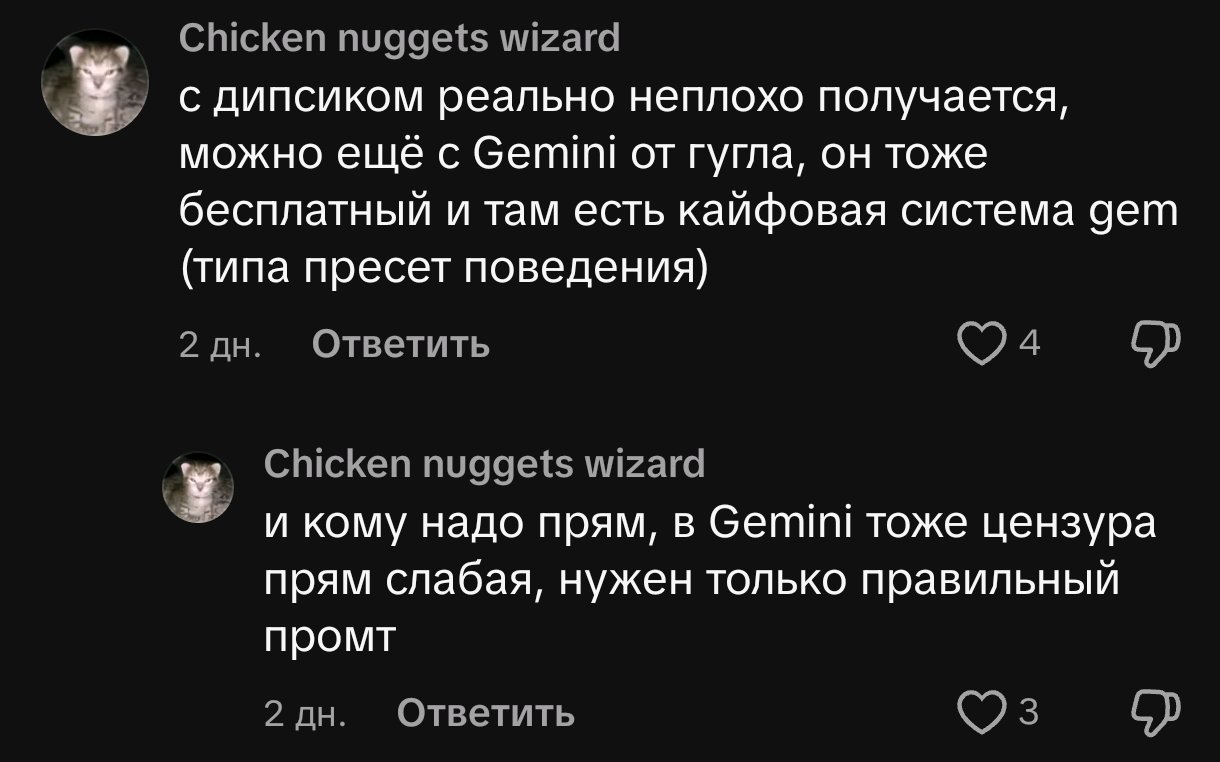 Бля, а дипсик не плох. Сейчас отыгрывал в очередной раз, как мамочка эджит йузера на но нат новембер и не даёт ему кончить, так дипсик сам придумал на третий день закрыть член йузера в клеточку между эджами. Очень сексуально было. Я перехожу на дипсик похоже...