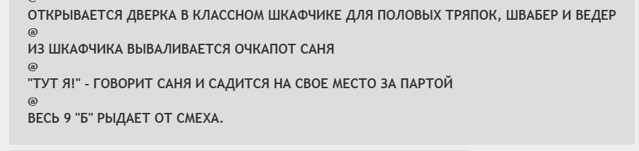 Заходит в седьмой: — Здравствуйте, сдаюсь. Эхо, Ассистентский разбор, Лупы — всё есть. — А карточка персонажа у вас есть? — Есть. — Так идите и выполняйте! Не мешайте людям работать