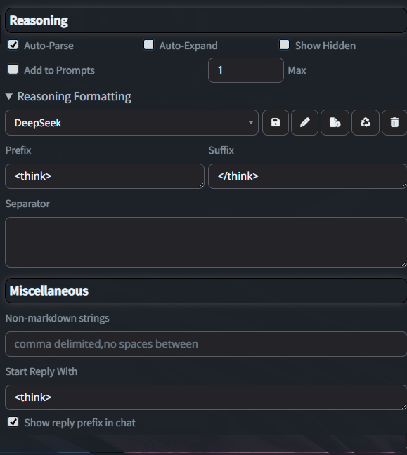 >>1243549 У меня ризонинг настроен так что часть его у меня стоит в промпте префиллом, а часть уже генерится позже. Он даже в таком формате расценивается отдельно?