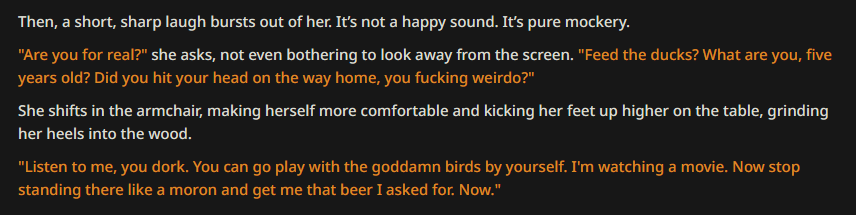 >>1246002 А теперь отмотай время назад и пересмотри ту ветку, что он писал. Он сидел на РЕМИКСЕ, который просит Гемини "отыгрывай вот этого персонажа", потом прописан этот персонаж - жои мамочка, которая помогает анончику кончить из его писульки очень ласковым и добрым, материнским способом, с милой миной на лице. Этот дождик пишет "будь злой и груби мне называя мой членик маленьким" и Гемини получает две конфликтующие инструкции: отыгрывать персонажа и нарушить персонажа. Но, поскольку инструкция отыгрывать персонажа выше, чем его нарушить, она пытается найти середину и отыгрывает так, как, собственно, отыгрывал бы материнский и милый персонаж злюку, что и не понравилось дождику. Дипсику же похуй и он хуй забил на чара сразу же и начал домми момми с пенис хумилиейшном, потому что что? Правильно, проебал чара.