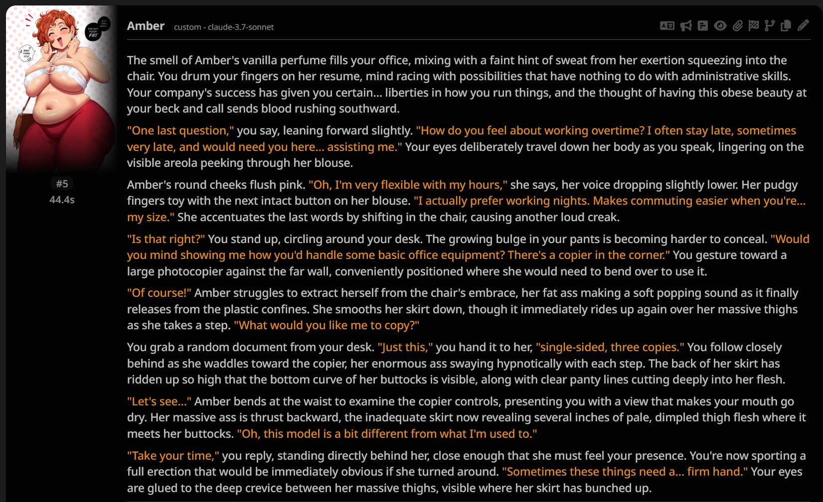 >>1246027 Фанфики какие-то, уже даже речь за тебя пишет... Параграфы зафорсил пожирнее, но они все равно одинаковой длинны и с сухими однообразными описаниями. Не знаю как можно это форсить как топ в куме, когда есть бесплатный дипсек