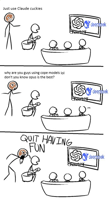 >>1245533 >чел прокси себе на месяц купи за 100 рублей и не еби мозги ну я об этом и говорю, на опенроутере был бесплатный дипсик, а теперь пиздуй искать какую-то ебучую проксю на парашном харкаче в треде где гейткипят каждый выпук. как же меня это всё заебало. я ведь ещё хотел пейпижить на опенроутере, хорошо что не успел.